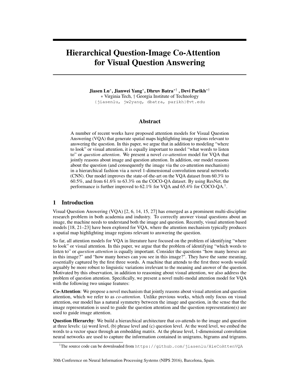 到目前为止,VQA相关文献中的所有注意力模型都集中在识别“往哪里看”或视觉注意的问题上。在本文中,我们认为识别“听哪些词”或关注问题同样重要。考虑问题“how many horses are in this image?”和“how many horses can you see in this image?”,它们具有相同的含义,基本上由前三个单词决定。关注前三个单词的机器对于与问题的意义和答案无关的语言变异更具鲁棒性。受此观察的启发,除了对视觉注意的推理外,我们还致力于对问题的关注。具体来说,我们针对VQA提出了一种新颖的多重注意力模型,它具有以下两个独特的功能: