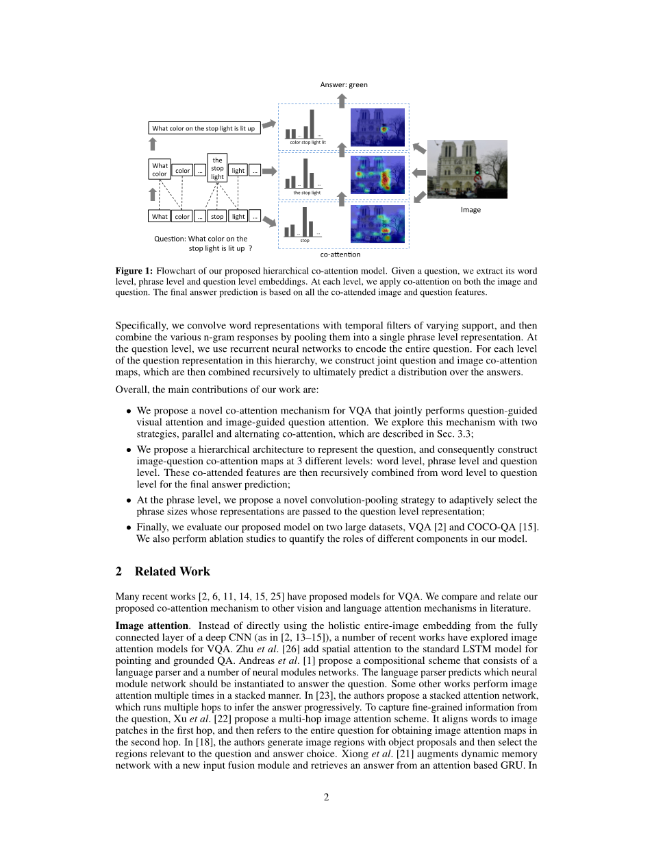 图像关注。与直接使用深度CNN全连接层的整体图像嵌入(如[2,13 - 15])不同,最近的一些工作探索了VQA的图像关注模型。Zhu等人将空间注意力添加到用于指向和接地QA的标准LSTM模型中。Andreas等人提出了一种由语言分析器和多个神经模块网络组成的组合方案。语言分析器预测应该实例化哪个神经模块网络来回答这个问题。其他一些文献则以叠加的方式多次进行图像关注。在[23]中,作者提出了一个叠加注意力网络,它运行多个跳数来逐步推断出答案。为了从问题中获取细粒度信息,Xu等人[22]提出了一种多跳图像关注方案。它首先将单词与第一跳中的图像块对齐,然后在第二跳中指向整个获取图像注意图的问题。在[18]中,作者生成带有对象建议的图像区域,然后选择与问题和答案选项相关的区域。Xiong等人[21]用一个新的输入融合模块增强了动态记忆网络,并从一个基于注意力的GRU中检索答案。在同时进行的工作中,[5]收集了“人类注意图”,用于评估由VQA的注意力模型生成的注意图。所有这些方法都仅建模解决视觉注意力,而不考虑问题注意力。此外,[22,23]依次对注意力进行建模,即后期注意力建立在前期注意力的基础上,容易导致错误差的传播。相反,我们在三个层次上独立地进行协同注意。