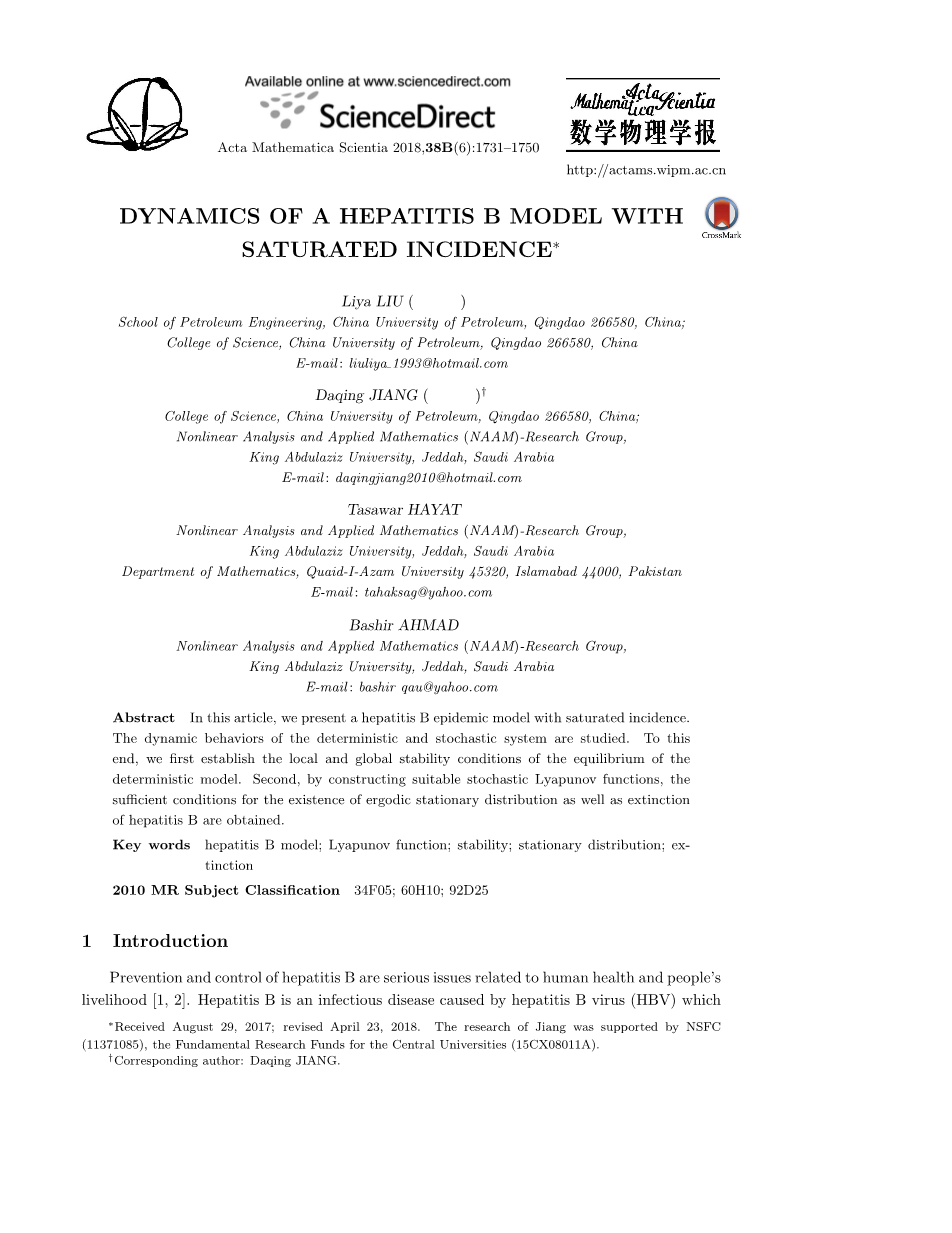 关键词 乙型肝炎模型;李雅普诺夫函数;稳定性;平稳分布;灭绝