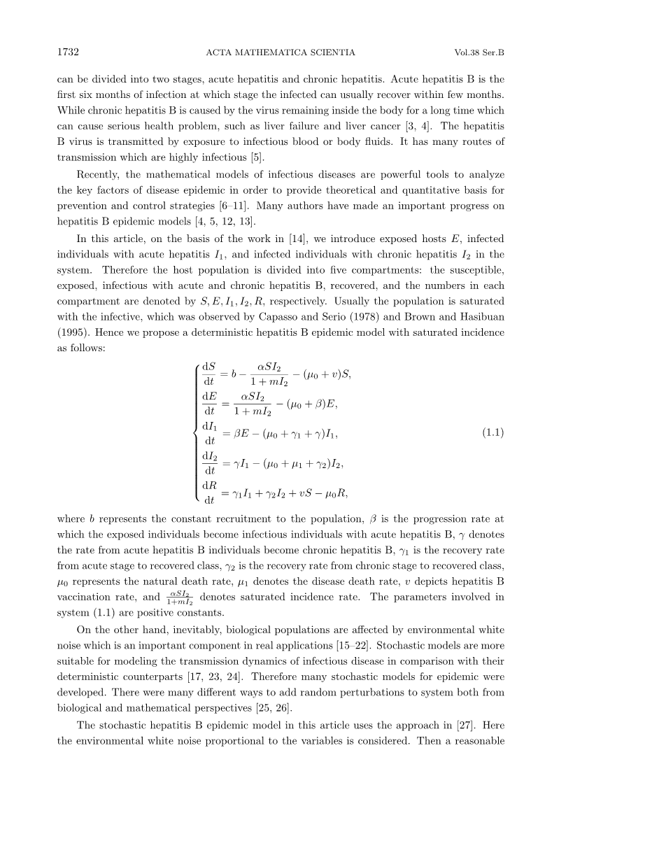 另一方面,生物种群不可避免地受到环境白噪声的影响,这是实际应用中的一个重要部分[15-22]。随机模型与确定模型相比更适用于传染病传播动力学的建模[17, 23, 24]。因此,许多流行病的随机模型得到了发展。在生物学和数学视角中,向系统中加入随机扰动的方法有很多种[25, 26]。