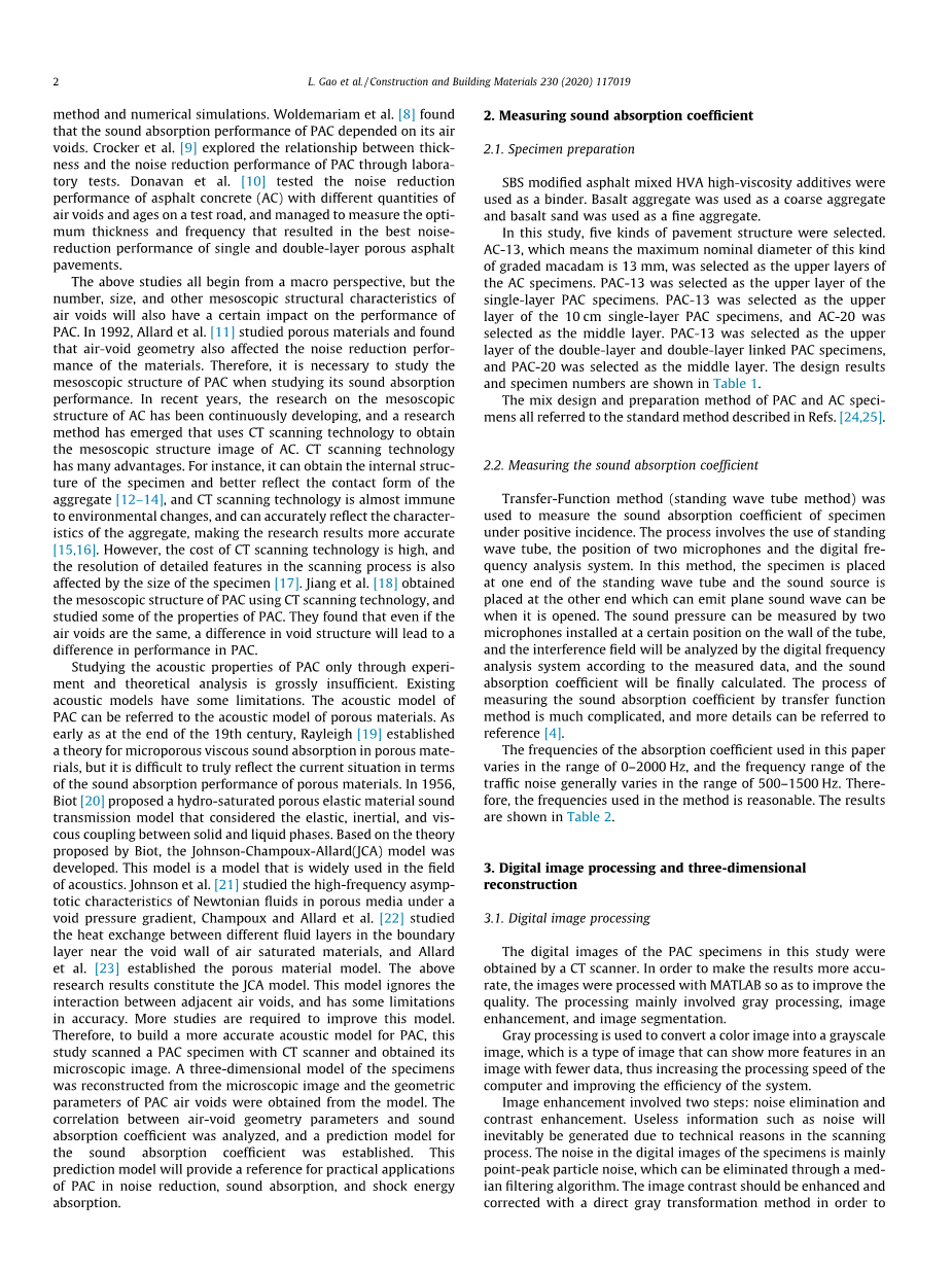 以上研究都是从宏观的角度进行的,但是空洞的数量、大小和其他空隙细观结构特征也会对PAC的降噪性能产生一定的影响。1992年,Allard等人[11]对多孔材料进行了研究,发现空穴几何结构对材料的降噪性能也有影响。因此,在研究PAC吸声性能时,有必要对其细观结构进行研究。最近几年,与AC的细观结构有关的研究不断发展,出现了一种利用CT扫描技术获取AC的细观结构图像的研究方法,CT扫描技术具有许多优点,例如,它可以获得样品的内部结构,更好地反映骨料的连接方式[12-14],而且,CT扫描技术几乎免疫环境变化的影响,能够准确地反映骨料的特性,使研究结果更加准确[15,16]。但是,CT扫描技术的成本很高,而且扫描过程中细节特征的分辨率也受到样本大小的影响[17]。Jiang等人[18]利用CT扫描技术获得了PAC的细观结构,并对PAC的一些性能进行了研究,他们发现,即使空隙率相同,空隙结构的差异也会导致PAC的性能差异。