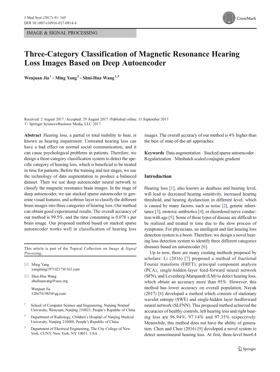 摘要: 听力部分损失或全部听不见,称为听力障碍。未经治疗的听力损失会对正常的社会交往产生不良影响,并可能导致患者的心理问题。因此,我们设计了三种分类系统来检测听力损失的具体类别,这对患者的及时治疗是有益的。在训练和测试阶段之前,我们使用数据扩充技术来生成一个平衡的数据集。然后利用深度自编码神经网络对脑磁共振图像进行分类。在深度自动编码器阶段,我们使用堆栈式稀疏自动编码器来生成这些特征,并使用softmax来对不同的脑图像进行分类,从而对听力损失进行分类,我们的方法可以获得良好的实验结果。我们的方法的总体精度可达99.5%,每幅大脑图像的耗时为0.078s。我们提出的基于堆栈式稀疏自动编码器的方法在听力损失图像分类中效果良好,其分类精度比目前最先进的方法还高4%。