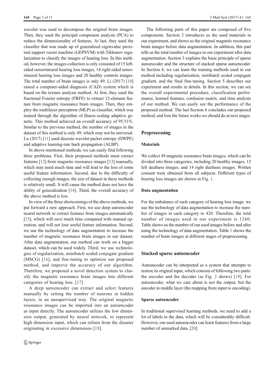 到目前为止,学者们提出的方法很多:李(2016)提出了分数傅立叶变换(FRFT)、主成分分析(PCA)、单隐层前馈神经网络(SFN)和Levenberg Marquardt(LM)检测听力损失的方法,其准确度超过95%。然而,这种方法对总体人群的精确度较低。Nayak(2017)提出了一种由平稳小波熵(SWE)和单隐层前馈神经网络(SLFNN)结合的方法,实现了健康对照组、左听力损失组和右听力损失组的准确率分别为96.94%、97.14%和97.35%,同时该方法不具备生成能力。Chen和Chen(2016)开发了一种新的系统来检测感音神经性听力损失。首先,利用三层Bior4.4小波对原始脑图像进行分解;然后,他们使用主成分分析(PCA)来降低特征的维数;最后,采用基于Tikhonov正则化的广义特征值近端支持向量机(GEPSVM)分类器对失聪图像进行分类。然而,在这种方法中,图像采集仅由15张左侧感音神经性听力损失图像、14张右侧感音神经性听力损失图像和20张健康对照图像组成。大脑图像的总数只有49张。李(2017)提出了一种基于纹理分析方法的计算机辅助诊断(CAD)系统。首先,他们使用分数傅立叶熵(FRFE)从磁共振脑图像中提取12个元素的特征。然后采用适应度尺度自适应遗传算法对多层感知器进行训练。该方法的总准确度为95.51%,与前面的方法类似,此方法的数据集中的图像数只有49个而且并不具有一般性。Lu(2017)使用离散小波包熵(DWPE)和自适应学习速率反向传播(ALBP)。