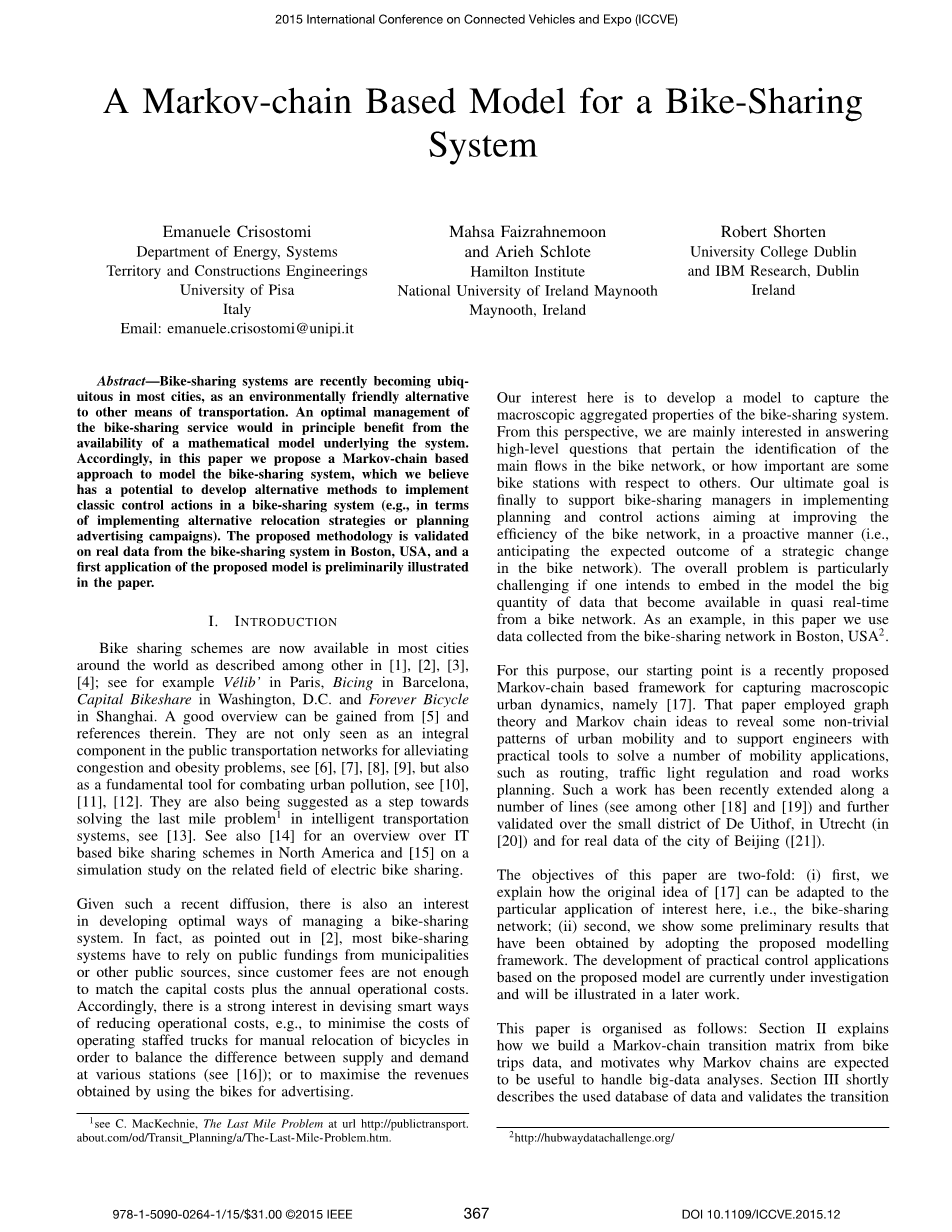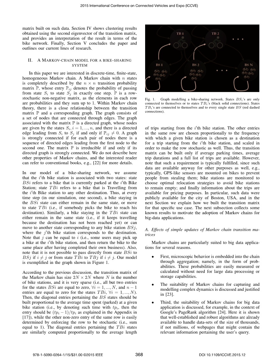 本文提出了一种新的基于马尔可夫链的模型来描述自行车共享网络的功能。该模型受到车辆类似工作的启发流动,并且适用于其中的具体应用其他的事情每个自行车站需要两个状态(即一个考虑停放在自行车站的自行车,以及一个考虑从该给定的自行车站出发的所有行程)。我们使用波士顿自行车共享网络的实际数据建立我们的马尔可夫链转换矩阵,并验证关于数据的模型。本文主要集中在建模部分,到目前为止所描述的实际应用只是聚类其中一个确实提供了一个有趣的划分自行车共享网络,无法从中提取以直截了当的方式提供相同的信息。然而,在我们的想法中,许多其他的实际应用可以基于在提出的模型上,特别是我们目前致力于设计新颖的搬迁策略和广告活动的新想法。为此我们计划使用其他变量,可以很容易地从中提取马尔可夫链(例如平均首次通过时间(MFPT)