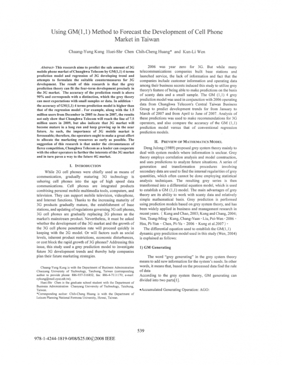 2. 本研究的分析表明,中华电信的3G手机销量可以用GM(1,1)4阶段模型进行预测,预测结果的准确性将在90%以上。这与灰色理论基于少量数据和小样本进行预测的能力以及新信息的优先级一致。