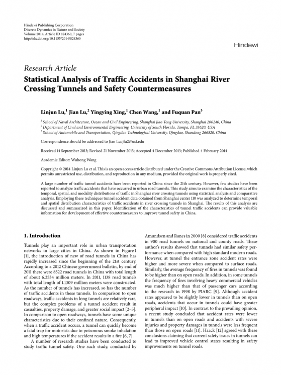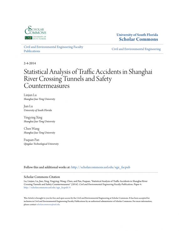 陆林军; 陆健; 邢莹莹; 王,陈; 和福,“福泉”,“上海河流交通事故统计分析”“穿越隧道与安全对策”(2014年)。土木与环境工程学院出版物。论文4。http://scholarcommons.usf.edu/egx_facpub/4