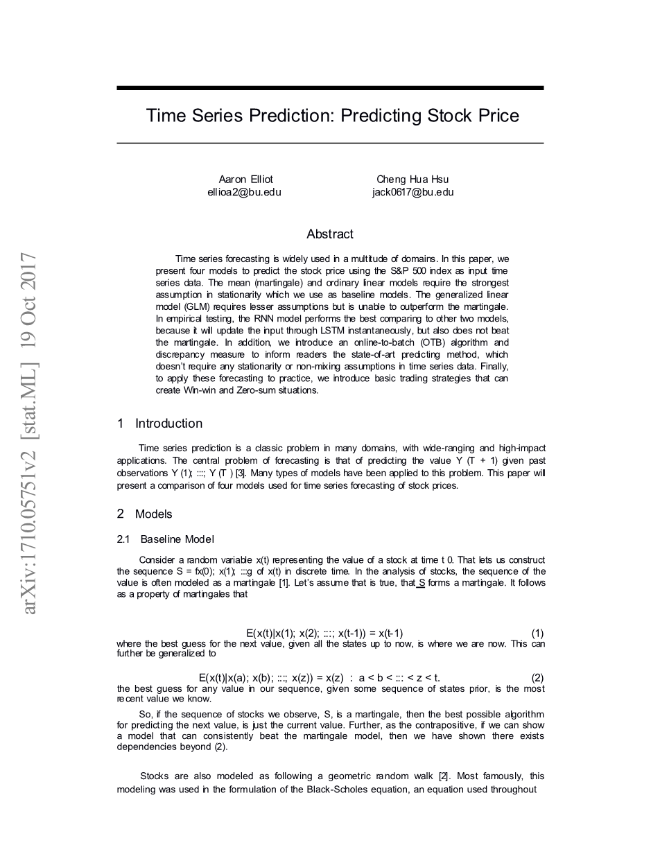 时间序列预测在许多领域得到了广泛的应用。本文提出了四种预测股票价格的模型,使用Samp;P 500指数作为输入的时间序列数据。均值(鞅)和普通线性模型在平稳性方面需要最强的假设,我们将其用作基线模型。广义线性模型(GLM)需要较弱的假设条件,但不如鞅的模型更准确。在实证检验中,与其他两种模型相比较,RNN模型表现最好。因为它将通过lstm实时更新输入,但也同样没有击败鞅。此外,我们还介绍了在线批处理(OTB)算法和差异度量,以便读者知晓最先进的预测方法,它不需要任何时间序列数据中平稳性或不混合的假设。 最后,为了将这些预测应用于实际,我们还介绍能够创造双赢和零和局面的基本交易策略。