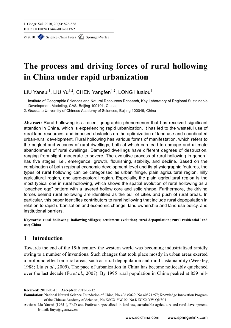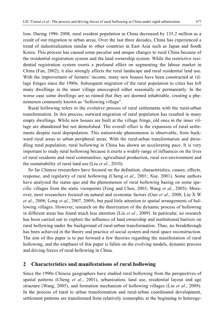 迄今为止,中国的研究人员一直关注着农村空心化的定义,特征,原因,影响,响应和规律。一些作者从静态的角度分析了农村空心化的现状和现象。此外,大多数研究人员关注自然和经济因素,但很少关注空心村的空间布局。然而,关于不同地区空心动力过程理论化的研究却没有引起重视。尤其是在城乡转型背景下,尚未开展研究探讨土地所有权和制度障碍对农村空心化的影响。因此,在社会系统和农村空间重建的理论和实践中没有取得突破。本文的目的是提出一些关于农村空心化现象的理论,并将本文的重点放在中国农村空心化发展的模式,动态过程和驱动力上。