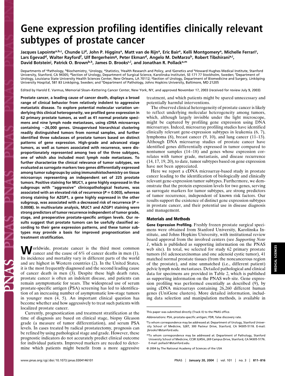 基因表达谱分析 从斯坦福大学,卡罗林斯卡研究所和约翰斯·霍普金斯大学获得新鲜冷冻的前列腺手术标本,并通过相关中心的机构审查委员会批准(见注释1,其作为PNAS网站上的支持信息发布)。总共,我们选择研究62个原发性前列腺肿瘤(61个腺癌和1个腺样囊性肿瘤),41个匹配的正常前列腺组织(来自前列腺的非癌区)和9个不匹配的(即不同的患者)盆腔淋巴结转移。表2提供了标本详细的病理和临床数据,该数据作为PNAS网站的支持信息发布。基本上如[9]所述通过使用含有26,260种不同人类基因(UniGene聚类)的cDNA微阵列进行基因表达谱分析。更多详细信息,包括数据选择和操作方法,可以在注释2中找到,该注释在PNAS网站上作为支持信息发布。