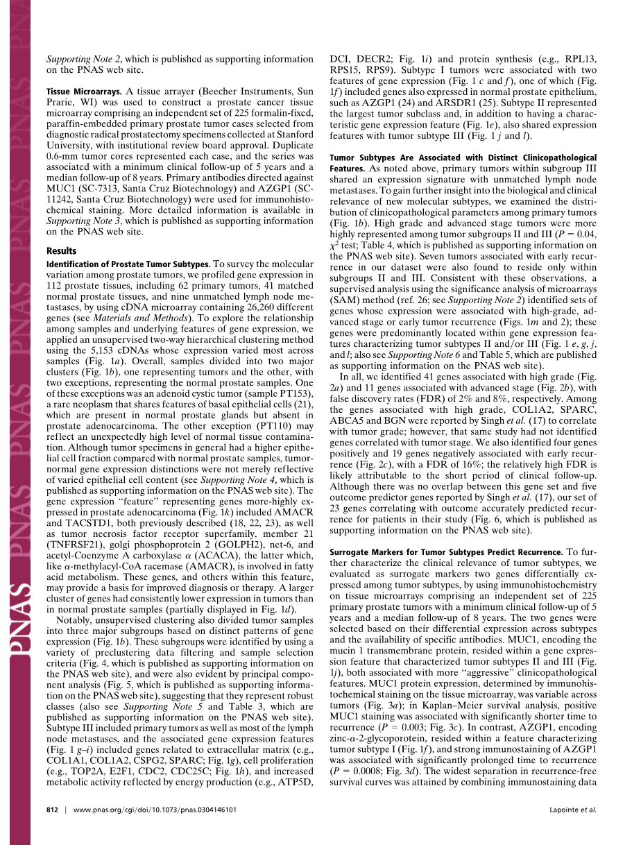 值得注意的是,无监督聚类也基于不同的基因表达模式将肿瘤样本分成三个主要亚组(图1b)。这些亚型通过使用各种预聚集数据过滤和样本选择标准(图4,其作为PNAS网站上的支持信息发布)来识别,并且也通过主成分分析(图5,其已公开 作为PNAS网站上的支持信息),表明它们代表健全的类别(另见注释5和表格3,它们作为PNAS网站上的支持信息发布)。亚型III包括原发肿瘤以及大部分淋巴结转移,并且相关的基因表达特征(图1g-1)包括与细胞外基质相关的基因(例如COL1A1,COL1A2,CSPG2,SPARC;图1g) ,细胞增殖(例如,TOP2A,E2F1,CDC2,CDC25C;图1h)以及由能量产生(例如ATP5D,DCI,DECR2;图1i)和蛋白质合成(例如RPL13,RPS15,RPS9)。亚型I肿瘤与基因表达的两个特征相关(图1c和f),其中一个(图1f)包括也在正常前列腺上皮中表达的基因,如AZGP1[24]和ARSDR1[25]。亚型II代表最大的肿瘤亚类,除具有特征性基因表达特征(图1e)外,还与肿瘤亚型III共享表达特征(图1j和l)。
