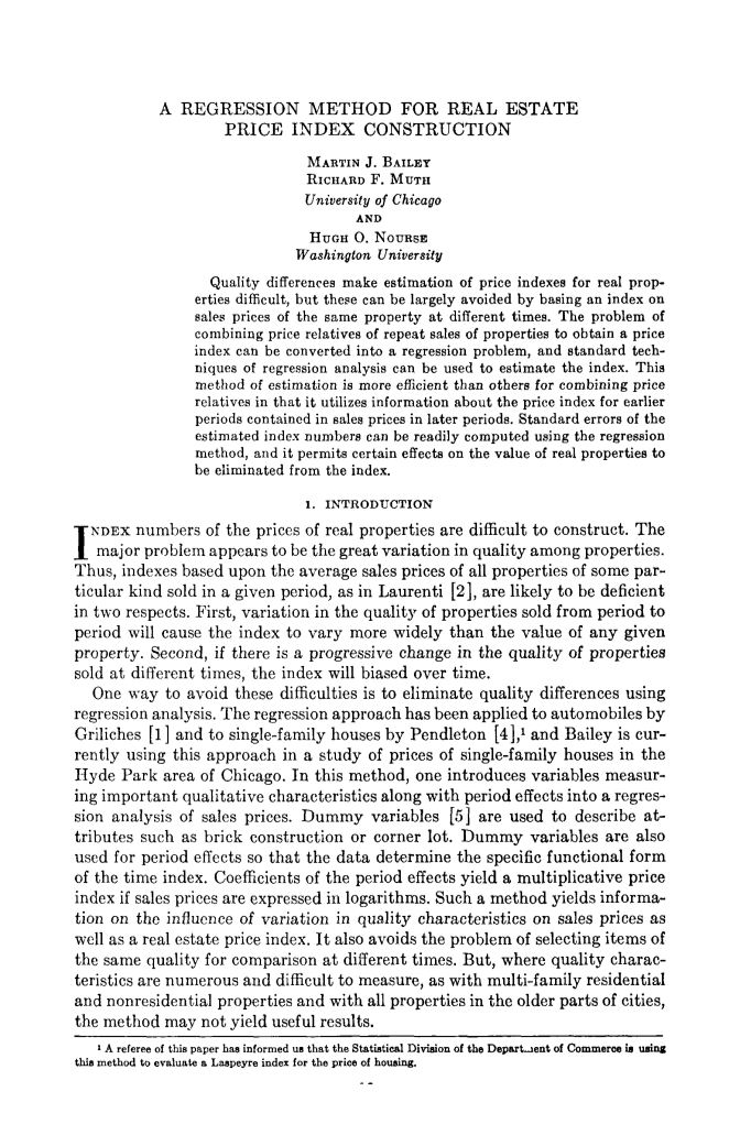 编制真实房地产价格指数是十分困难的。 主要问题就是房地产存在较大的异质性。因此,基于某一特定时期出售的某种特定类型产业的平均销售价格(如劳伦蒂[2])编制的指数在两个方面上可能是不足的。首先,从前期到后期的产业性质变化将会导致指数的变化范围比任何基期值都大。其次,如果在不同时间出售的房地产性质逐步发生变化,该指数将随着时间的推移而出现偏差。