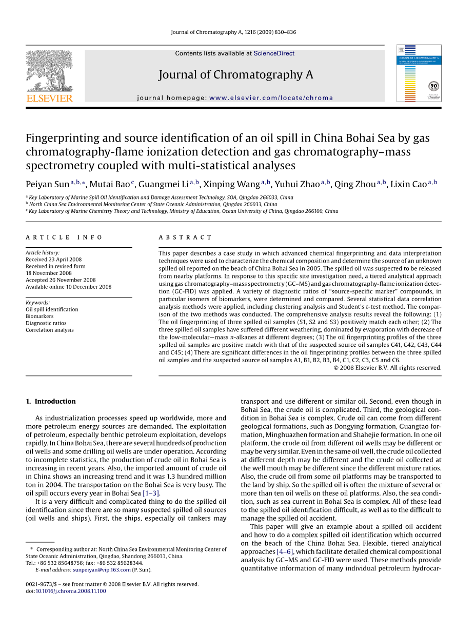 中国渤海海域溢油的指纹识别与油源识别色谱 - 火焰离子化检测和气相色谱 - 质谱光谱分析与多元统计分析相结合