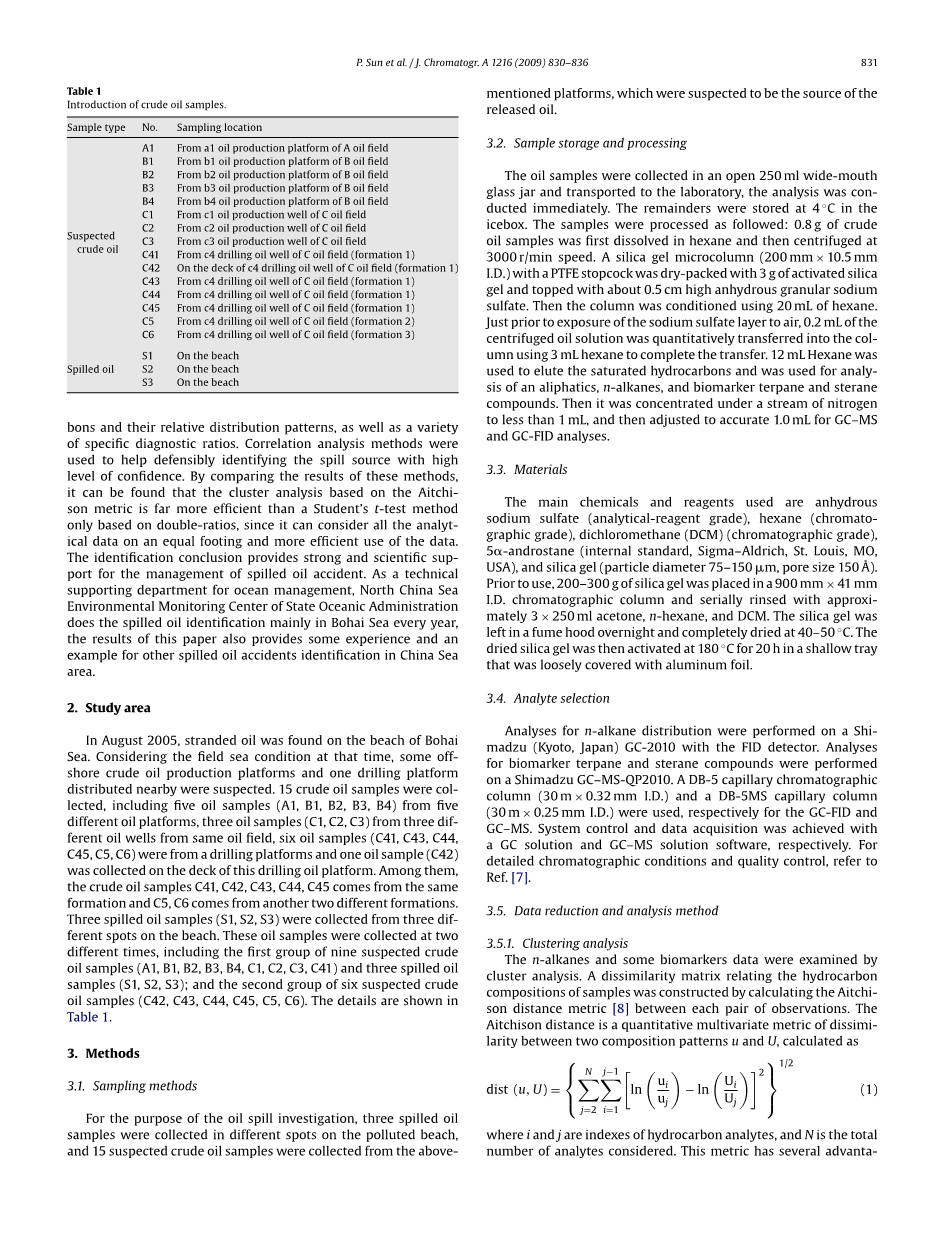 2005年8月,渤海海滩发现搁浅的石油海。考虑到当时的海域条件,一些离岸原油生产平台和在附近分布一个钻井平台怀疑。收集了15个原油样本,其中包括来自5个石油平台的5个油样(A1,B1,B2,B3,B4),来自同一油田三个不同油井的三个油样(C1,C2,C3),还有六个油样(C41,C43,C44,C45,C5,C6)来自钻井平台和一个油样(C42)在这个钻井平台的甲板上被收集。其中,原油样品C41,C42,C43,C44,C45来自同一地层和C5,C6来自另外两个不同的地层。从沙滩上的三个不同地点采集了三个溢油样本(S1,S2,S3)。这些油样在两个不同时间收集,包括第一批的9个可疑原油油样(A1,B1,B2,B3,B4,C1,C2,C3,C41)和三溢油样本(S1,S2,S3);第二批的6个可疑原油油样(C42,C43,C44,C45,C5,C6)。细节显示在表格1。
