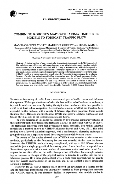 几个小组已经提出神经网络作为短期交通预测的可能方法:Dougherty等(1993),Dougherty和Cobbett(1994),Smith和Demetsky(1994)和Dochy等(1995年)。通常采用的方法是使用多层前馈网络(通常也称为反向传播网络)来实现最近过去和未来流的流之间的广义映射。很明显这种方法只是部分有效,引入一些关于统计方法的证据,如线性回归和ARIMA,但其性能通常比ATHENA方法更差(Kirby等,1994)。这个一般规则的一个例外是Dochy(1995)等人报道的工作,即再次使用Beaune数据集但应用反向传播网络。性能与ATHENA极具竞争力。 然而,这项工作沿着与ATHENA方法相同的“强力”线进行,通过使用大量单独调谐的神经网络一天的不同时间,也很可能会受到上面列出的问题影响。
