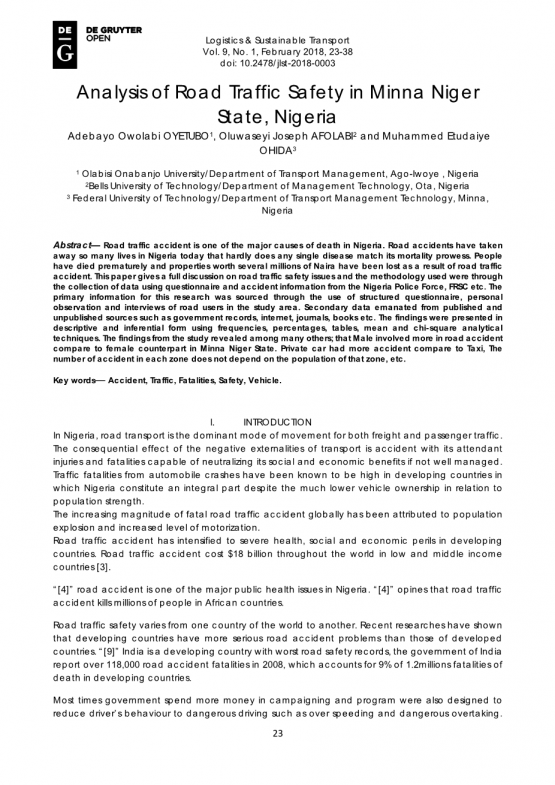 在尼日利亚,公路运输是货运和客运的主要运输方式。运输的负外部性的后果是事故,伴随着伤亡,如果管理不善,会降低其社会和经济效益。众所周知,在发展中国家,汽车碰撞造成的交通事故死亡率很高,其中尼日利亚便是这些国家之一,尽管车辆拥有量要比人口数量低得多。全球致命道路交通事故日益严重的原因是人口爆炸和机动化程度的提高。道路交通事故增多,对发展中国家的健康、社会和经济造成严重危害。全世界低收入和中等收入国家因道路交通事故损失了180亿美元[3]。交通事故是尼日利亚的主要公共卫生问题之一[4]。在非洲国家,道路交通事故造成数百万人死亡。道路交通安全因世界各国而异。近年来的研究表明,与发达国家相比,发展中国家的道路交通事故问题更为严重。印度是一个道路安全记录最差的发展中国家,印度政府报告说,2008年有118000多人死于道路事故,占发展中国家120万人死亡人数的9%[9]。