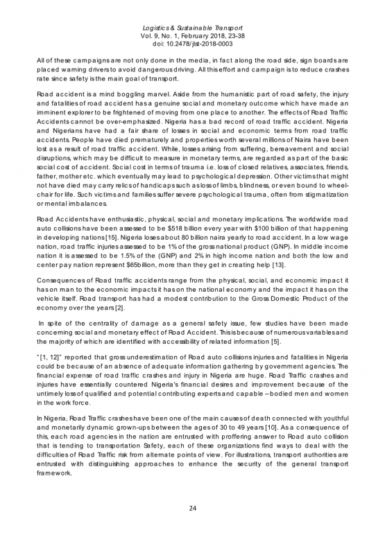道路交通事故令人难以置信。除了道路安全的人文部分之外,道路事故造成的伤亡具有真正的社会和金钱后果,这使一个即将到来的的探险家害怕从一个地方到另一个地方。道路交通事故的影响再怎么强调也不过分。其中尼日利亚的道路交通事故记录不佳。尼日利亚在道路交通事故造成的社会和经济损失中占有相当大的份额。由于道路交通事故的发生,人们过早死亡且丧失了价值数百万奈拉的财产。然而,可能难以用金钱衡量的痛苦如丧亲之痛和社会混乱所造成的损失被视为事故基本社会代价的一部分。创伤造成的社会代价,即失去亲人、同事、朋友、父亲、母亲等,最终可能导致心理抑郁。其他没有死亡的受害者可能会残疾,如失去肢体,失明,甚至终身受轮椅束缚。这些受害者和家庭遭受严重的心理创伤往往来自耻辱或心理失衡。
