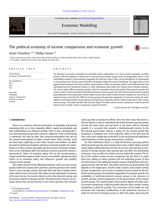有大量关于不平等和增长的理论文献,既研究了不平等如何影响资本积累,也研究了再分配如何影响增长。也有越来越多的文献证明,一个人的主观幸福感不仅受到自己收入/消费的影响,也受到周围人收入/消费的影响。最近,人们对这些“收入外部性”如何影响资本积累路径进而影响经济增长进行了探索。我们的贡献是关注不平等和个人之间收入比较的存在如何影响增长的政治经济,即政府对经济政策的选择。我们通过提出一个简单的模型来做到这一点,该模型捕捉到“收入外部性”和政府对影响收入群体增长和流动性的经济政策的选择。