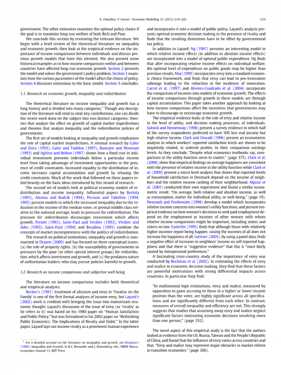 我们通过回顾相关文献来总结本节。我们首先简要回顾一下关于不平等和经济增长的理论文献,然后看看关于个人收入比较重要性的经验证据,并讨论先前具有这一因素的增长模型。我们还提供了一些关于国家内部和国家之间的收入比较如何影响长期经济增长的历史例子。第2节给出了该模型,并解决了政府的策略问题。第3节研究模型的各种参数如何影响策略的选择。第4节讨论对基本模型的扩展。第五节作总结。