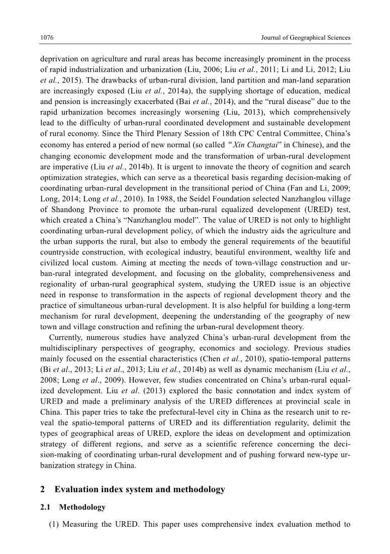 目前,许多研究从地理学,经济学和社会学的多学科视角分析了中国的城乡发展。以往的研究主要集中在基本特征,时空模式以及动力机制上,很少有研究集中在中国的城乡均衡发展上。刘彦随等人探讨了URED的基本内涵和指标体系,并初步分析了中国省级的URED差异。本文试图以中国地级市为研究单位,重新研究URED的时空格局及其分化规律,划分URED的地理区域类型,探讨不同的发展思路和优化策略,作为协调城乡发展决策和推进中国新型城镇化战略的科学参考。
