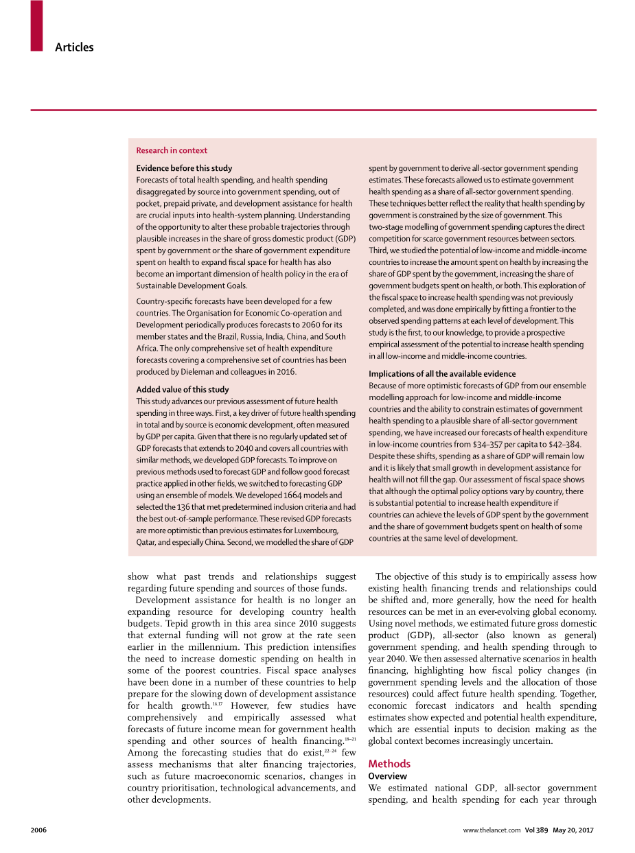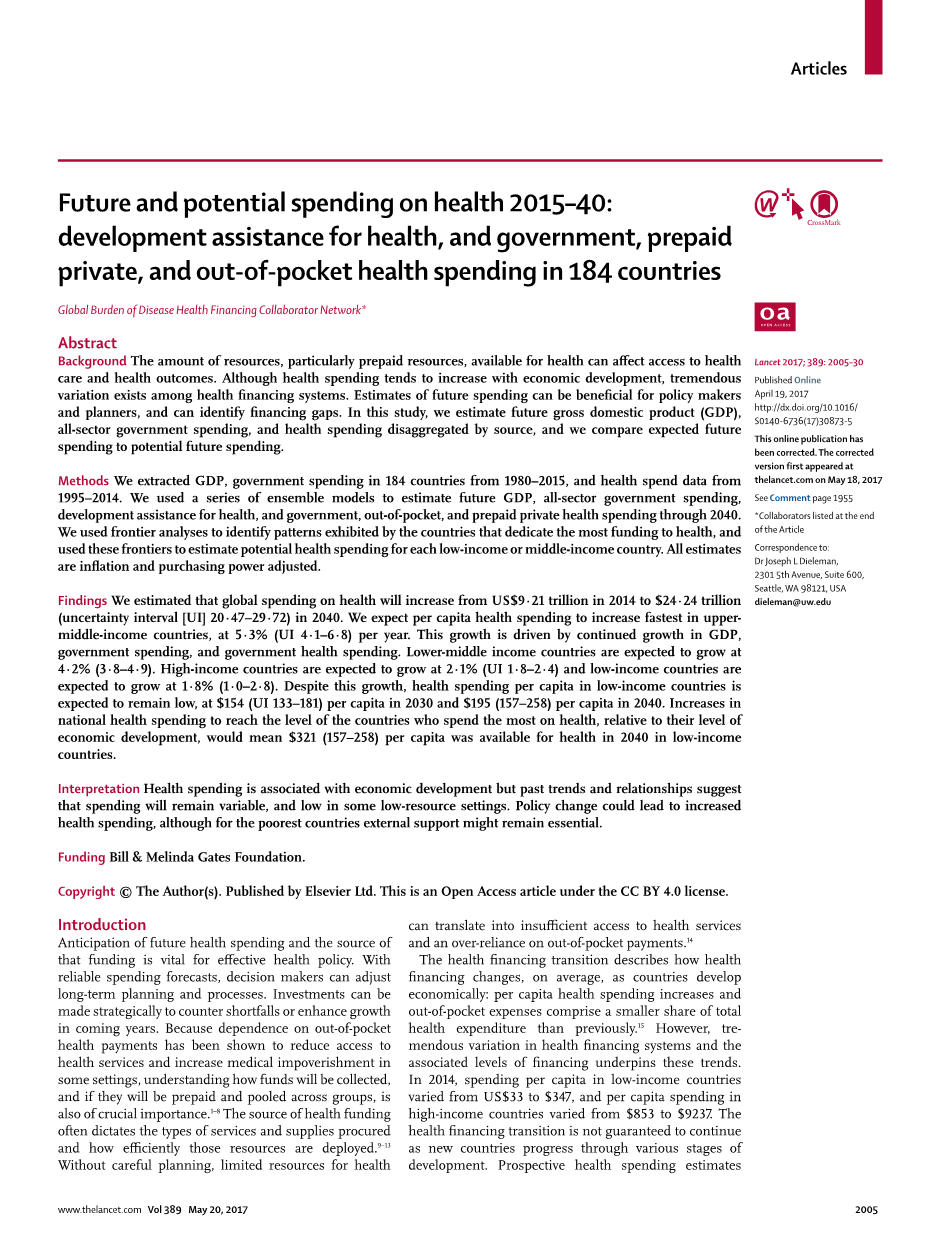 我们估计了在健康方面的全球的开支将会从 US$9 增加·21 兆 2014 到 $24·24 兆 (不确定间隔 [UI]20·47-29·72) 在2040. 我们期待花费在中上-收入国家中增加得最快速的每人健康, 在 5 点·3%(UI 4·1-6·8) 每一年。 这生长被国内生产毛额,政府开支和政府健康开支的继续生长驱使。 比较低-中央收入国家在 4 点被期望生长·2% (3·8-4·9). 高收入国家在 2 点被期望生长·1%(UI 1·8-2·4) 和低收入国家在 1 点被期望生长·8% (1·0-2·8). 不在乎这生长,每人在低收入国家的健康开支被期望保持低, 在 $154(UI 133-181)2030 和 $195 每人 (157-258) 每人在2040. 花费到达把大部分花在健康的国家的水平国家的健康增加,相对于他们的经济发展的程度,会意谓 $321(157-258) 每人在低收入国家中在 2040 年可用来健康。