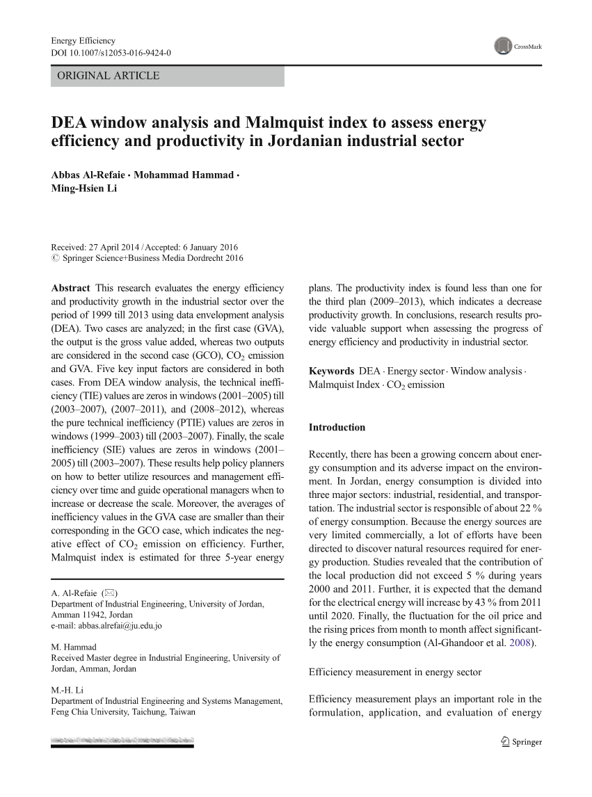 用于评估约旦工业部门能源效率和生产率的DEA窗口分析和Malmquist指数