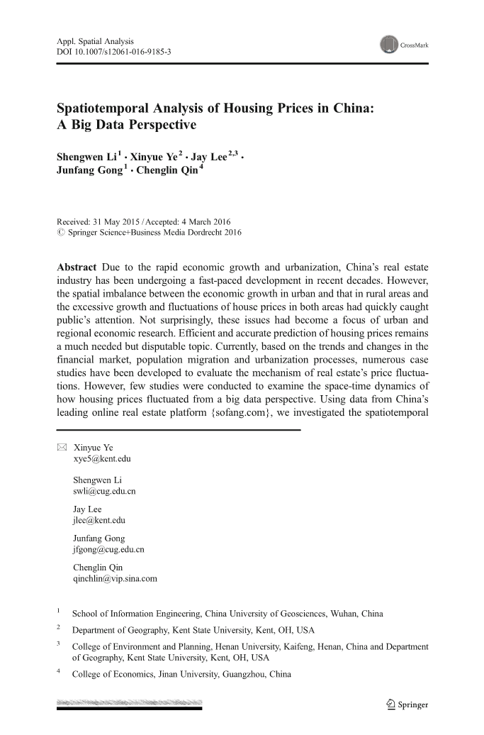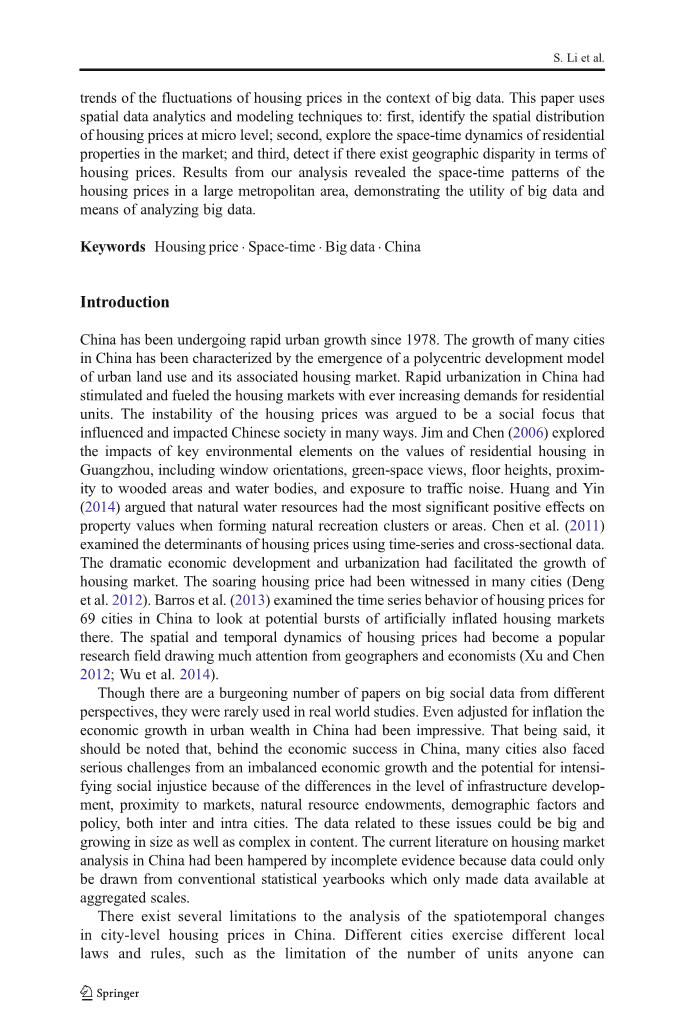 从1978年至今,中国城市化快速发展,许多城市的发展模式是以多中心土地利用和发展相应住房市场为特征。中国快速的城市化进程推动了住房市场的发展,使得住房需求不断增加。同时,房价的不稳定问题也称为一个社会焦点,在许多方面对中国社会发展产生了影响。 Jim和Chen于2006年探讨了环境因素对广州住宅价值的影响,环境因素包括窗户朝向、绿色空间景观、楼层高度、小区绿化和水体以及交通噪音。Huang和Yin认为,自然水资源对房产价值的有着极大影响。2010年,Chen等人利用时间序列和横截面数据研究了房价的决定因素,认为急速的经济发展和城市化促进了住房市场的发展,房价的飞涨在许多城市都有体现。2013年,Barros等人对中国69个城市的房价的时间序列进行了研究,以观察中国可能存在的人为膨胀的房地产市场。房价的时空动态已经成为地理学家和经济学家关注的热门研究领域。