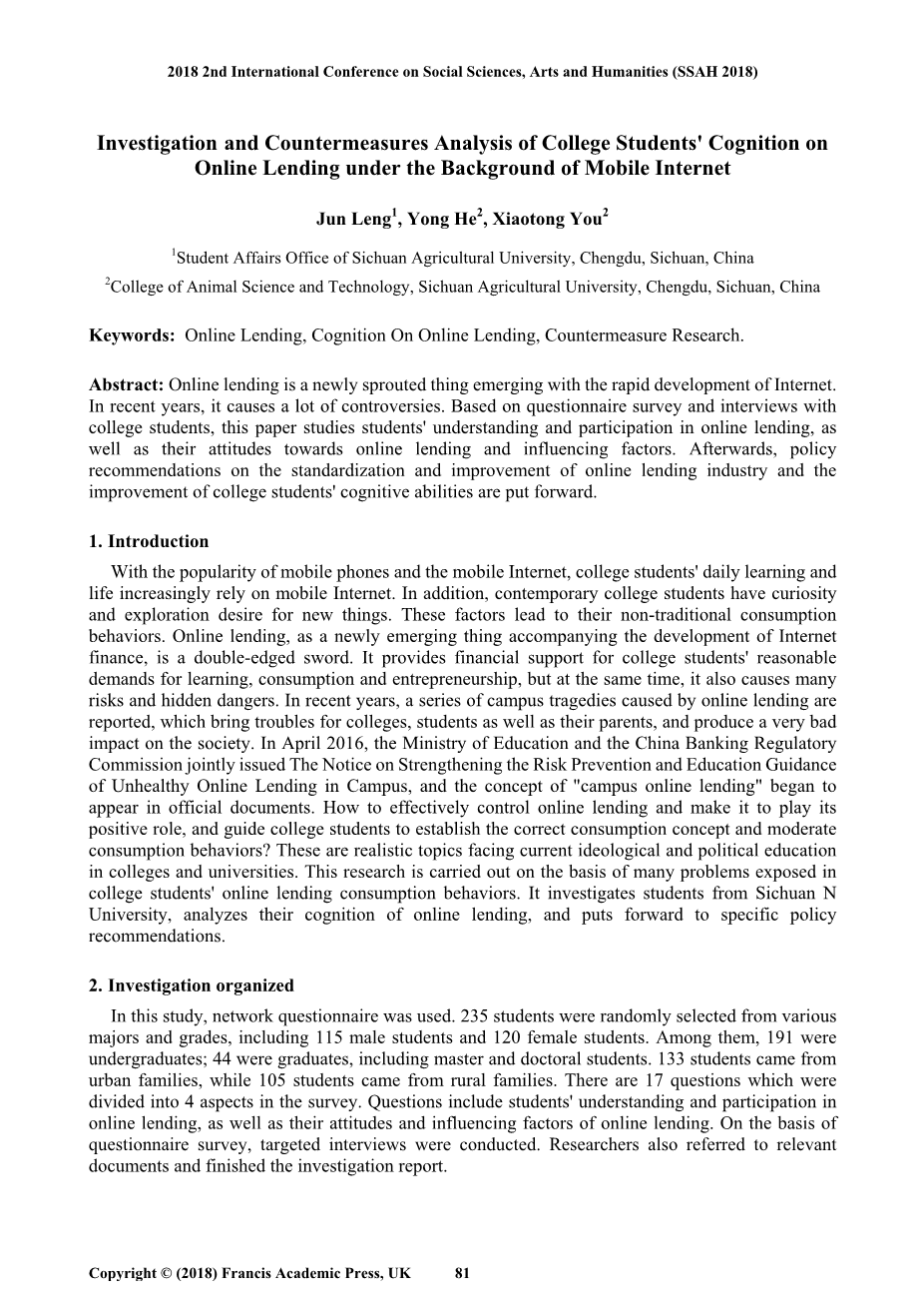 随着手机和移动互联网的普及,大学生的日常学习和生活越来越依赖移动互联网。 此外,当代大学生对新事物有着强烈的好奇心和探索欲望。这些因素也导致了他们的不符合传统的消费行为。网络借贷作为伴随着互联网金融发展的新兴事物,是一把双刃剑。网络借贷为大学生对学习,消费,创业的合理诉求提供了资金支持,但同时也带来了诸多风险和隐患。近年来,网络借贷引发的一系列校园悲剧被报道,这不仅是给高校、学生以及家长带来了麻烦,还对社会产生了非常恶劣的影响。 2016年4月,教育部、中国银监会联合下发《关于加强校园行不良网络借贷风险防范和教育引导工作的通知》,“校园行网上借贷”概念开始在官方文件中出现。如何有效控制网络借贷,使其发挥积极作用,引导大学生树立正确的消费观念和适度的消费行为?这些都是当前高校思想政治教育面临的现实课题。本研究是在大学生网络借贷消费行为中暴露出的诸多问题的基础上进行的。调查了四川大学学生,分析了他们对网络借贷的认知,并提出了具体的政策建议。