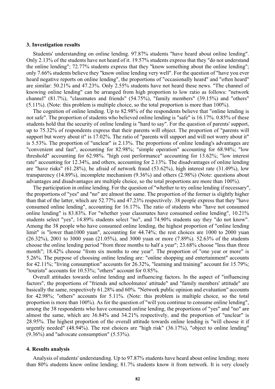 通过调查结果可得学生对网络借贷的了解程度:其中有97.87%的学生“听说过网络借贷”,只有2.13%的学生没有听说过。 19.57%的学生表示“不了解网络借贷”;72.77%的学生表示“对网络借贷有所了解”;只有7.66%的学生认为“非常了解网络借贷”。 对于“你有没有听过网络借贷负面报道”的问题,“偶尔听到”和“经常听到”的比例差不多:50.21%和47.23%。只有2.55%的学生没有听到这些消息。“了解网贷的渠道”由高比例到低比例可排列如下:“网络渠道”(81.7%)、“同学朋友”(54.75%)、“家人”(39.15%)、“他人”(5.11%)。 (注:此题为多选题,故总比例大于100%)。此外,大学生对网络借贷的认知结果如下:高达82.98%的受访者认为“网络借贷不安全”,认为网络借贷“安全”的学生比例为16.17%。 其中0.85%的大学生认为,网络借贷的安全性“很难下定论”。 对于父母是否支持的问题,高达75.32%的受访者表示,他们的父母会反对;“父母会支持但会担心”的比例为17.02%;“父母会支持、不会担心”的比例为5.53%; “不清楚”的比例为2.13%。 关于网络借贷的优点选项的比例为“方便快捷”,占比82.98%;“操作简单”,占比68.94%;“门槛低”,占比62.98%。“高性价比”占13.62%;“低利率”占12.34%,其他占2.13%。网络借贷的弊病选择结果为“有风险”(61.28%)、“害怕网络诈骗” (53.62%)。对于“必要时是否尝试网络借贷”的问题,“是”和“否”的比例几乎相同,但前者的比例略高于后者,分别为52.77%和47.23%。 其中有38人表示“已进行过网络借贷消费”,占比16.17%;“未进行过网络借贷消费”的学生比例为83.83% 。对于“你的同学是否进行过网络借贷消费”,10.21%的学生选择“是”,14.89%的学生选择“否”,74.90%的学生表示“不知道”。 在进行过网络借贷消费的38人中,“网络借贷限额”比例最高的是“低于1000元”,占44.74%;其余的选项比例为1000元至2000元(26.32%)、2001元至3000元(21.05%)、3000元以上(7.89%)。对于网络借贷期限,52.63%的学生选择了“三个月到半年”的网络借贷期限;23.68%的学生选择了“三个月以下”;18.42%的学生选择了“六个月到一年”;“一年以上”的比例为5.26%。 关于选择网络借贷的目的:“网购娱乐”占42.11%;“生活消费”占26.32%,“学习培训”占15.79%;“游客”占10.53%;“其他”占0.85%。对网络借贷的总体态度及影响因素的调查结果:在“影响因素”方面,“朋友和同学态度”和“家庭成员态度”的比例基本相同,分别为61.28%和60%。 “网络舆情与评价”占42.98%;“其他”占5.11%。(注:此题为多选题,故总比例大于100%)。对于“你还会继续消费网络借贷吗”的问题,在38位消费过网络借贷的受访者中,“是”和“否”的比例几乎相同,分别为36.84%和34.21%,“不清楚”的比例为28.95%。 对于网络借贷的整体态度,比例最高的是“如果急需就会选择”(48.94%)。其余选择为“网络借贷具有高风险”(36.17%)、“反对网络借贷”(9.36%)和“倡导网络借贷消费”(5.53%)。