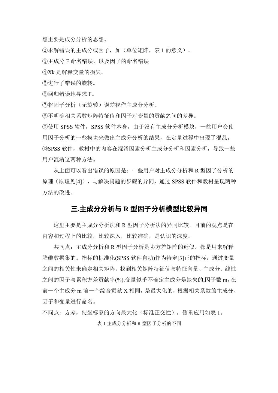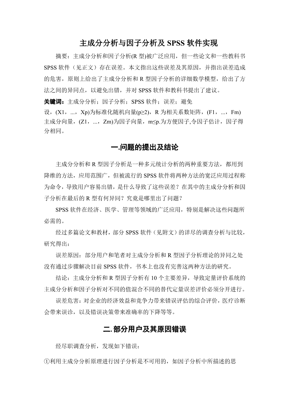 Abstract: The principal component analysis and factor analysis (R-type) is widely used, but some papers and some textbooks SPSS software (see text) error. This paper points out these errors and their causes, and points out the harm caused by errors, in principle gives the principal component analysis and R-type factor analysis of the detailed mathematical model of similarities and differences between the methods are given to avoid making mistakes, and the SPSS software and made recommendations about textbooks.