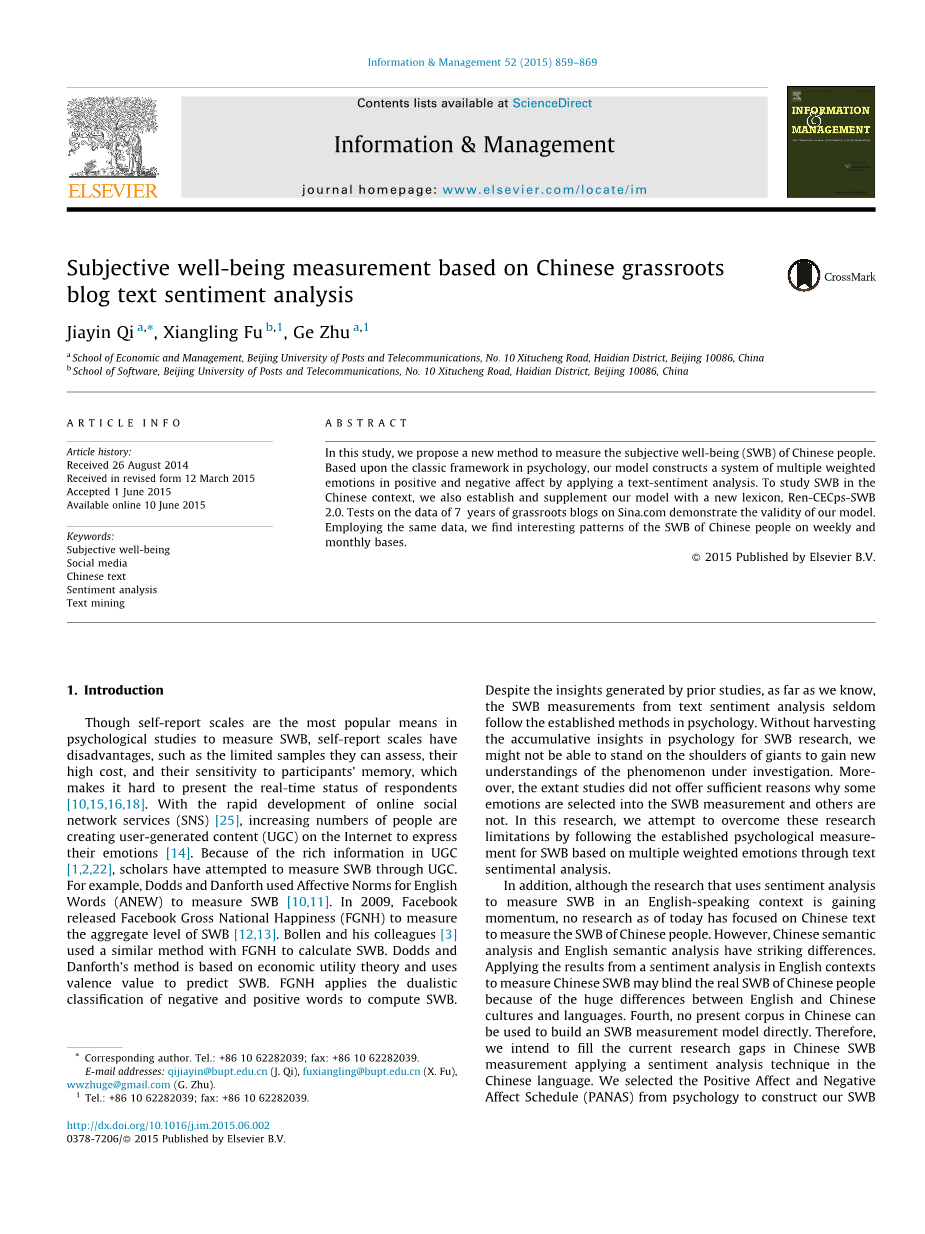 关键词:主观幸福感;社交媒体;中文文本;情感分析;文本挖掘
