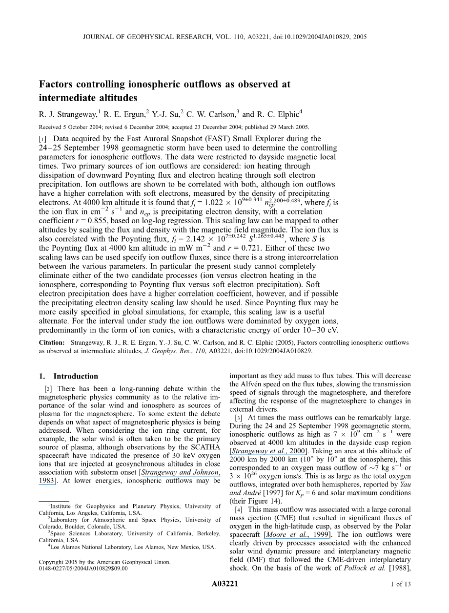 [12] 我们探索离子流出的各种潜在驱动力之间的统计关系,如在FAST高度观察到的,有两个原因。 第一个是确定哪个是最好的控制参数。 第二个是提供可用于希望包括电离层流出的计算模型(例如,Winglee等人,2002)但具有取决于外部驱动器的可变速率的缩放定律。 这些比例定律应该被视为与提供流出率作为诸如或的指数的函数的其他法律互补(例如,Peterson等人,2001,以及其中的参考文献)。