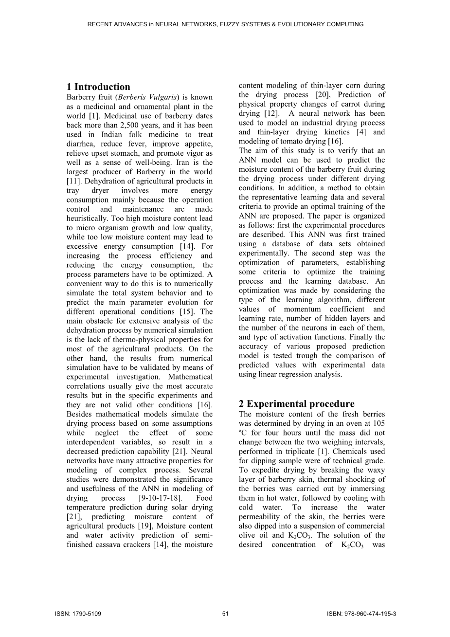 伏牛水果(小檗果实)是一种药用和观赏类植物。早在2500年前,伏牛就体现了其药用价值。在印度民间医药中,它有治疗腹泻、减少发热、提高食欲、缓解胃部不适的作用,也可以提高人的活力以及幸福感。伊朗是世界上的伏牛生产大国。将农产品的脱水的托盘干燥机需要很多能量,所以在维护和控制机器这一块会产生费用。伏牛过高的含水量导致微生物的生长和伏牛低质量,而它过低的水含量可能会导致能量消耗过大。提高干燥机器的处理效率和降低能量消耗,工艺参数必须被优化。数字模拟系统是一种便捷的方式,预测的主要参数进化不同的操作条件。大部分的农产品缺乏热物理性能是数值模拟脱水过程的主要障碍。另一方面,从数字的结果仿真已通过的装置进行验证实验研究。数学模型通常给出最准确的结果,但在具体的实验和它们不是最有效的。此外通过数学模型模拟,由于根据一些假设干燥过程而忽视某些效果依存变量,所以导致预测能力下降。神经网络有许多吸引人的特性,它没有复杂过程建模。现已经有一些关于干燥过程的研究是基于人工神经网络进行的:预测食品太阳能干燥过程中的温度,预测农产品的水分含量,预测木薯饼干和半成品的水分含量,预测薄层玉米内容干燥过程的水分,预测在胡萝卜的干燥过程物理性质的变化,模拟的工业干燥过程,番茄干燥过程的建模。