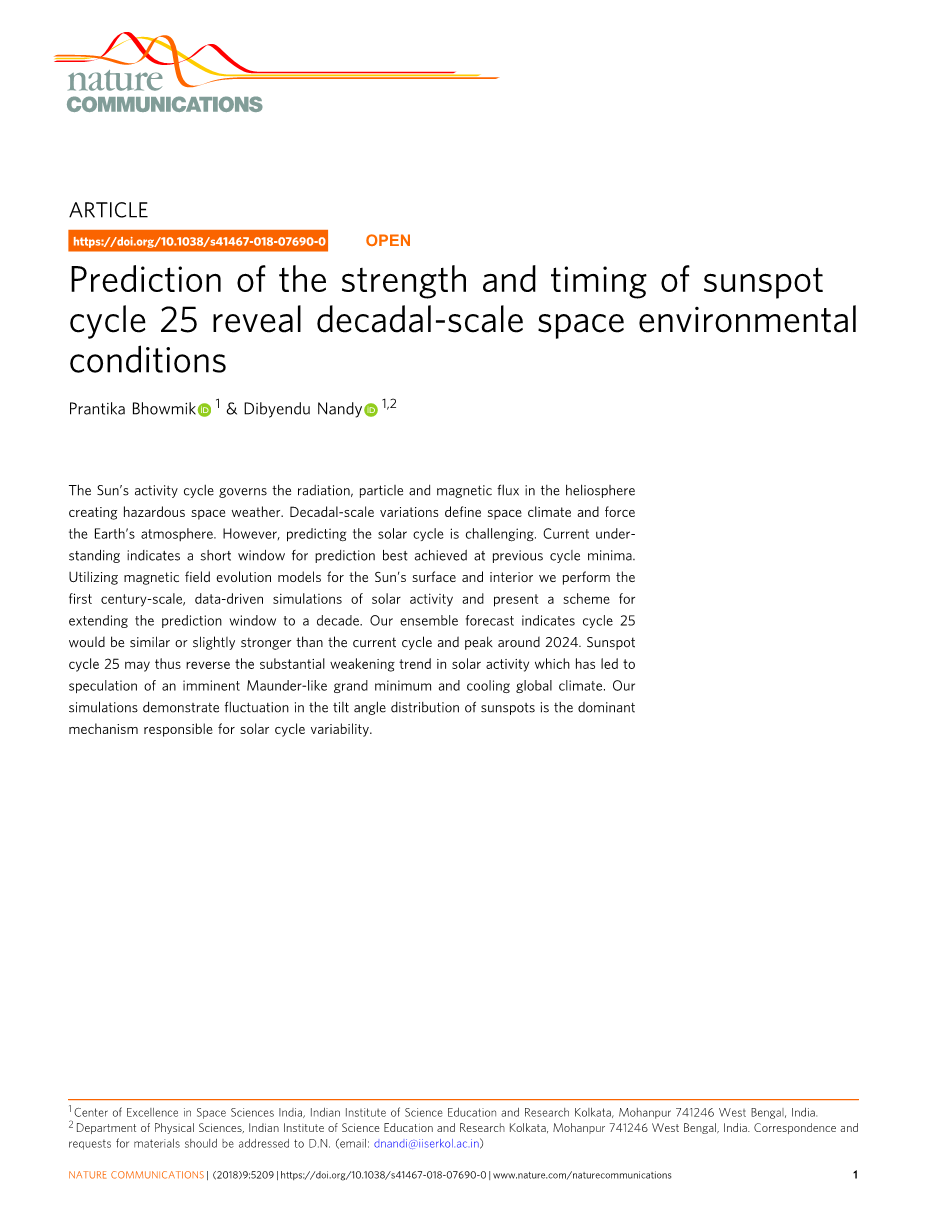 太阳的活动周期支配着日光层的辐射、粒子和磁通量,从而形成了危险的空间天气。以十年为尺度的变化定义了太空气候状况,并进一步决定地球的大气层状况。然而,预测太阳活动周期具有难度。目前研究表明,只有最小周期内的短期预测能达到较好效果。利用太阳表面和内部的磁场演化模型,我们对太阳活动进行了第一个以世纪为尺度的数据模拟,并提出了将预测期延长到十年的方案。我们的整体预测显示,第25太阳周相似于或略强于当前周期及2024年出现的峰值。因此,第25太阳周可能逆转太阳活动大幅减弱的趋势,这一趋势曾导致人们猜测,太阳活动将出现一个类似于“大极小期”(maundertype grand minimum)的现象,并导致全球气候变冷。我们的模拟表明,太阳黑子倾斜角度分布的波动是太阳周期变化的主要机制。