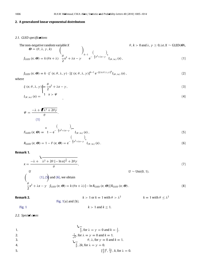 非负随机变量是一个有四个参数的GLED当且,这样,如果概率密度函数(pdf)如下: