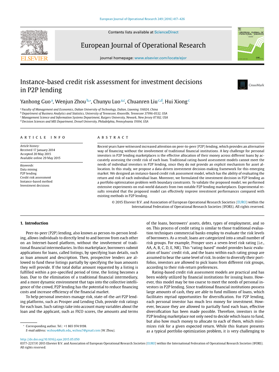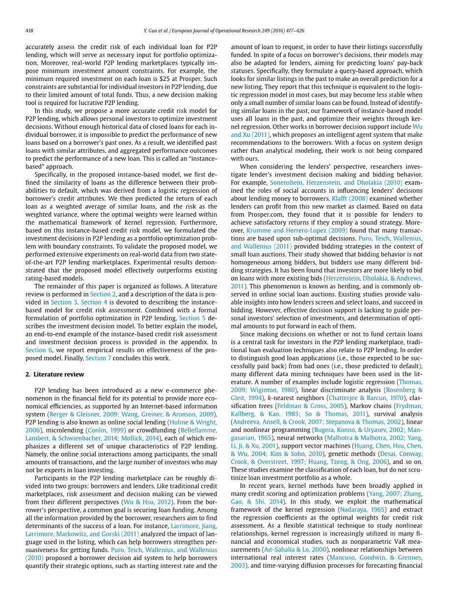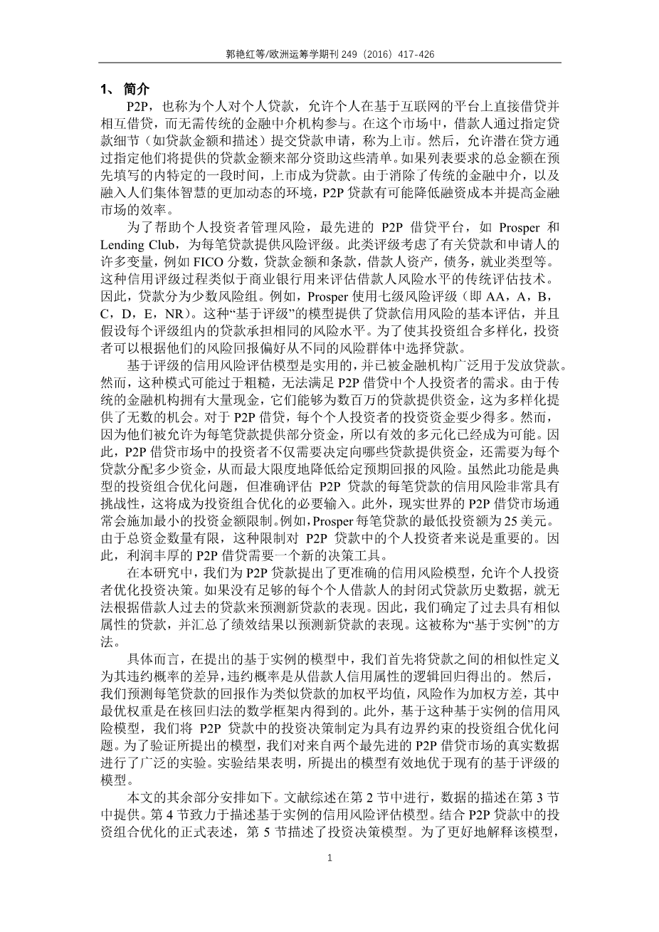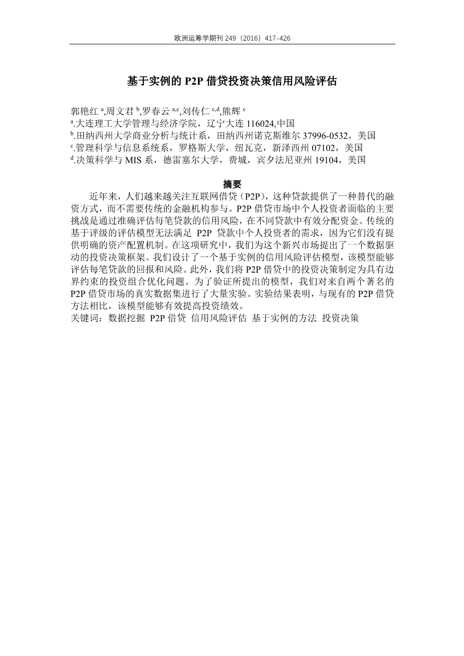 大学生网贷信用风险评估研究外文翻译资料 2021-12-19 21:23:52 英语原文共 10 页 英语原文共 20 页资料编号:[4434] 原文和译文剩余内容已隐藏,您需要先支付 30元 才能查看原文和译文全部内容!立即支付 发小红书推广免费获取该资料资格。点击链接进入获取推广文案即可: Ai一键组稿 | 降AI率 | 降重复率 | 论文一键排版 PREVIOUS NEXT 您可能感兴趣的文章 基于一个幂GARCH模型对黄金市场的研究外文翻译资料 主成分分析教程外文翻译资料 逐步回归的显著性检验外文翻译资料 大数据挖掘:回顾外文翻译资料 DSSAE-BBOA:基于深度学习的气象大数据分析和可视化外文翻译资料 使用G或K点模式空间统计的统计推断外文翻译资料 李代数的扩张结构外文翻译资料 灾民居住偏好转变:以2016年日本熊本地震后益城三波面板数据为例外文翻译资料 影响印尼证券交易所投资的因素-增进对资本市场的了解外文翻译资料 基于JMP的教育数据挖掘外文翻译资料