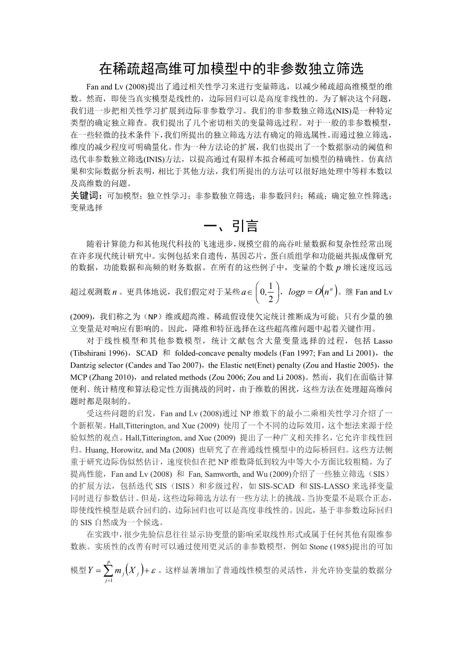 在稀疏超高维可加模型中的非参数独立筛选外文翻译资料