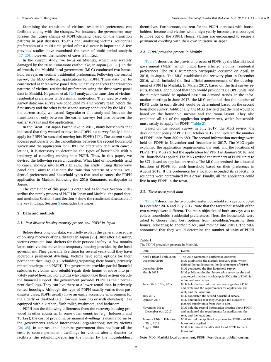 在2011年东日本大地震中,许多在调查中表示想搬入PDPH的家庭最终没有申请PDPH(或取消搬入PDPH)[17]。当前的研究特别关注第二次住户调查和PDPH申请之间的取消。为了有效应对取消,有必要确定具有取消倾向的家庭类型进入PDPH。因此,在本文中,我们设计了以下研究问题:什么样的家庭倾向于取消搬入PDPH?总之,这项使用三波面板数据的研究旨在阐明在2016年日本熊本地震后倾向于取消的益城PDPH申请的受害者居住偏好和家庭类型的转变模式。