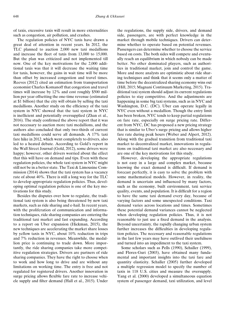 然而,在大型复杂的市场中制定适当的法律法规并不容易,因为了解确切的需求是相当困难的。如果能够精确预测需求,可以通过一些数学模型轻松解决问题。然而在实际情况下,需求是不确定的并且会受到许多因素的影响,例如经济,建筑环境,出租车服务质量,项目本身和人口等的影响。由于各种因素和意外情况,一个地区难以在每天都拥有相同的出租车需求。出租车需求因地点和时间而异。在制定监管政策时,这些潜在的需求差异是不容忽视的。因此,在分析中仅使用固定需求是不合理的。除了不确定性外,快速变化的城市系统进一步增加了制定监管政策的难度。过去几年必要且合理的规定可能已经逐渐变得无用,并成为当下出租车系统的障碍。