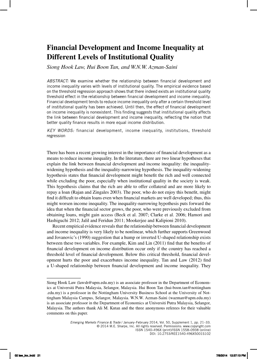 Siong Hook Law(lawsh@upm.edu.my)是马来西亚雪兰莪州马来西亚大学经济系的副教授。 Hui Boon Tan(hui boon.tan@nottingham.edu.my)是马来西亚雪兰莪州诺丁汉大学商学院的教授。W.N.W. Azman-Saini(wazman@upm.edu.my)是马来西亚雪兰莪州马来西亚大学经济系的副教授。作者感谢Ali M. Kutan和三名匿名审稿人对本文的宝贵意见。