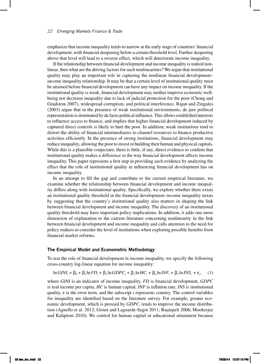为了填补这一空缺并为当前的实证文献做出贡献,我们研究了金融发展与收入不平等之间的关系是否与制度质量不同有关。具体而言,我们通过建议国家的制度质量在建立金融发展与收入不平等之间的联系方面也很重要,以此来探讨金融发展--收入不平等关系中是否存在制度质量门槛。发现制度质量门槛可能具有重要的政策指导意义。此外,它还为当前关于金融发展与收入不平等之间联系的非线性的文献增加了一个解释度量,并呼吁注意政策制定者在探索金融市场改革可能带来的好处时需要考虑制度水平。
