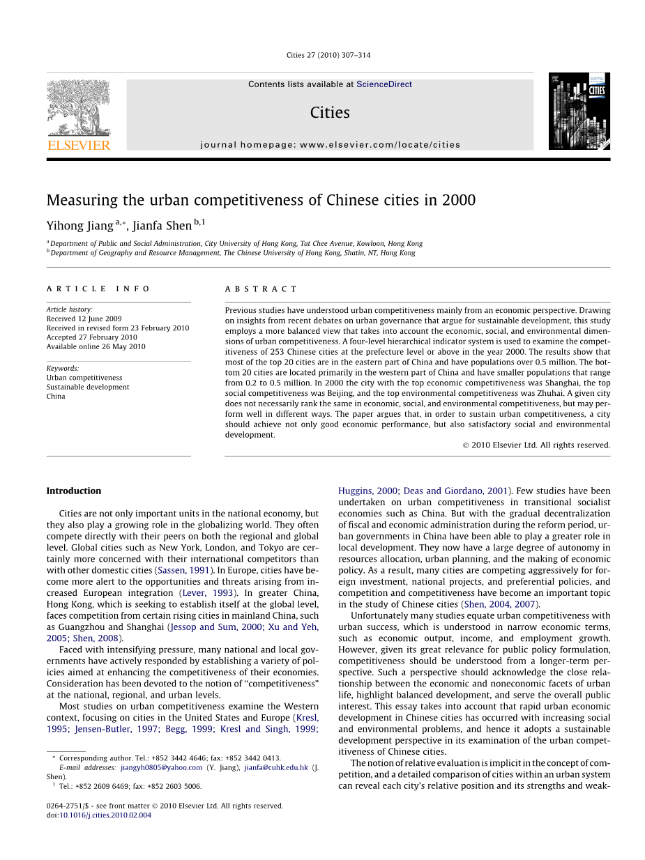 城市不仅是国民经济的重要组成部分,而且在全球化的世界中也扮演着越来越重要的角色。 他们经常在区域和全球层面与同龄人直接竞争。 纽约,伦敦和东京等全球城市肯定比国内其他城市更关注其国际竞争对手(Sassen,1991)。 在欧洲,城市对欧洲一体化进程增加带来的机遇和威胁越来越警觉(Lever,1993)。 在大中国地区,寻求在全球范围内建立自身地位的香港面临来自中国内地某些新兴城市的竞争,如广州和上海(Jessop and Sum,2000; Xu and Yeh,2005; Shen,2008)。