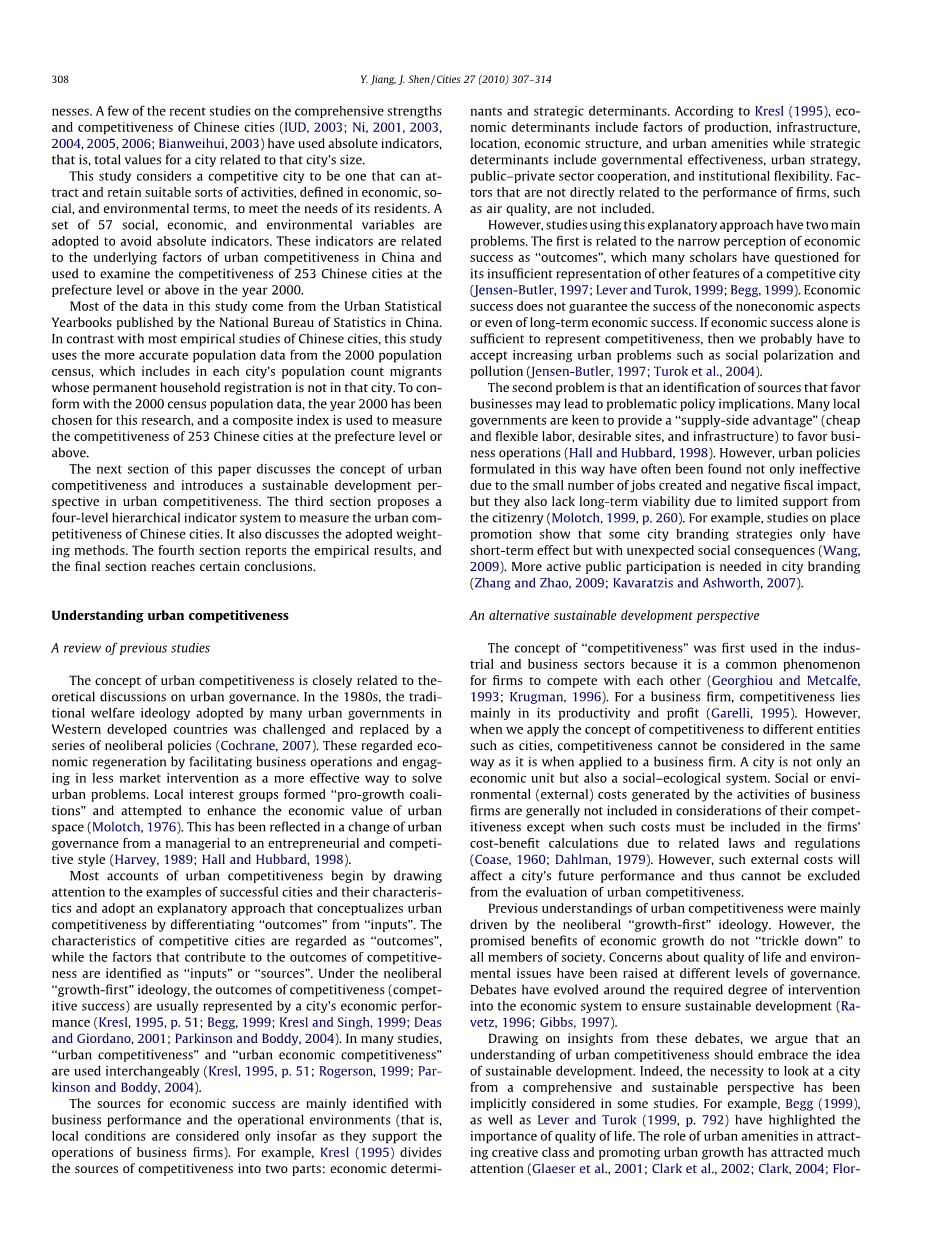 大多数关于城市竞争力的研究考察了西方的背景,重点关注美国和欧洲的城市。(Kresl,1995; Jensen-Butler, 1997; Begg, 1999; Kresl and Singh, 1999;Huggins, 2000; Deas and Giordano, 2001)关于中国等转型社会主义经济体的城市竞争力研究很少。但随着改革期间财政和经济行政的逐步分散,中国的城市政府在地方发展中发挥了更大的作用。他们现在在资源配置,城市规划和制定经济政策方面拥有很大程度的自主权。因此,许多城市正在积极争取外资,国家项目和优惠政策,竞争和竞争力已成为中国城市研究的重要课题(Shen,2004,2007)。