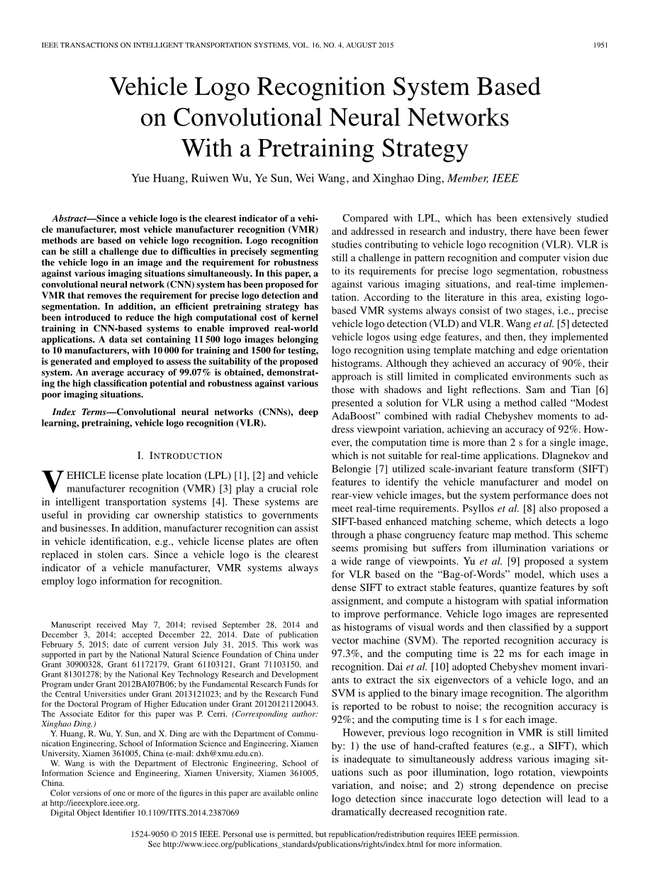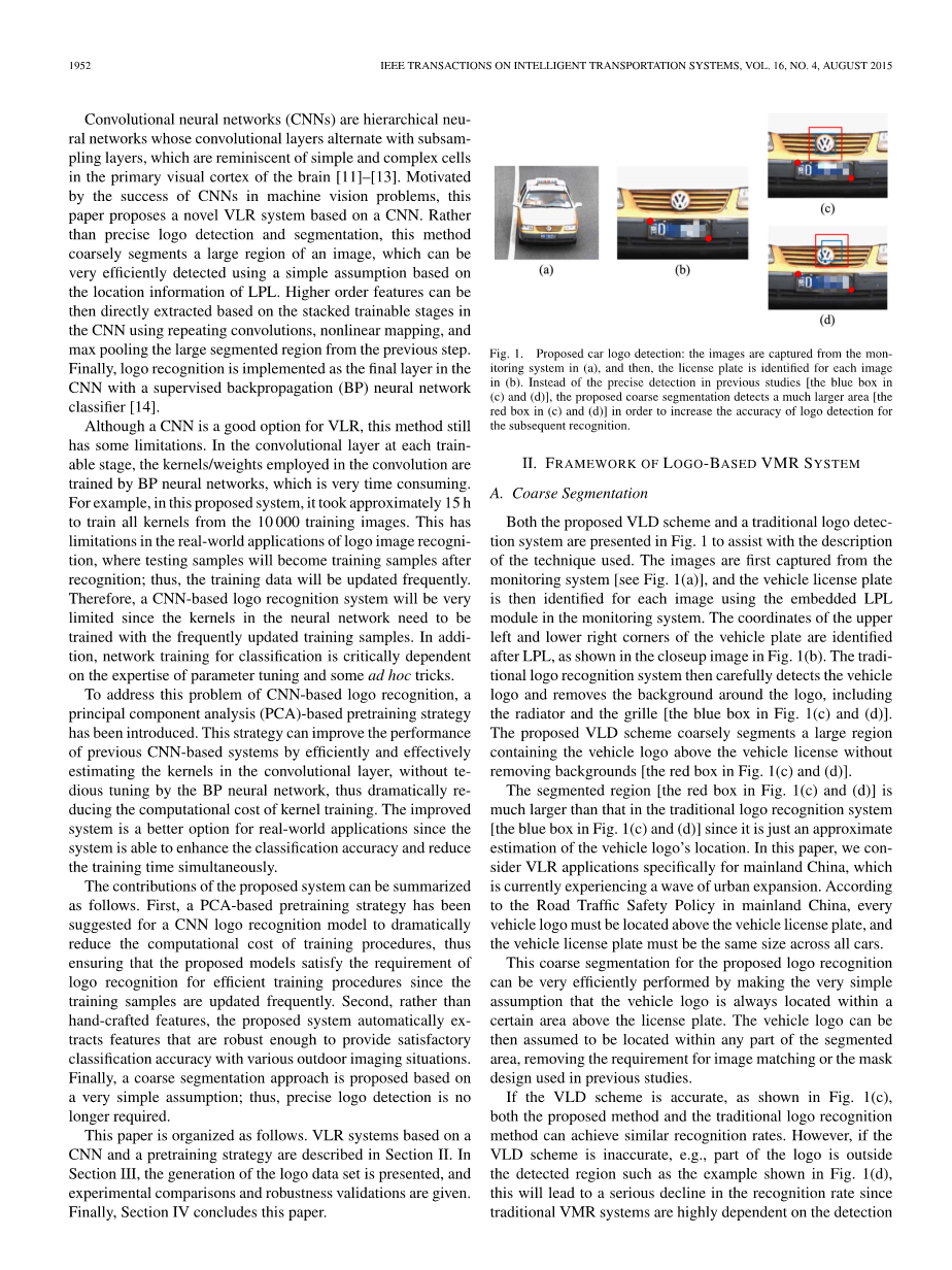 黄、吴、孙、丁毕业于厦门大学信息科学与工程学院工程专业,现在交通部工作,王是电子工程学院信息科学与工程的学生,本文中的一个或多个数字的颜色版本可以在网上找到网址http://ieeexplore.ieee.org.Digital Object Identifier 10.1109/TITS.2014.2387069和已广泛研究的LPL相比,在研究和工业领域,很少有人提及。有助于车辆标志识别(VLR)的研究。VLR是仍然是模式识别和计算机视觉中,实时实现针对各种成像情况对精确的标志分割、鲁棒性的要求的一个挑战,根据这方面的文献,现有的基于logobased VMR系统总是由两个阶段组成,即精确车辆标志检测(VLD)和VLR。 Wang等人检测到使用边缘特征的车辆标志,然后,他们实施使用模板匹配和边缘定位直方图。 虽然他们达到了90%的准确率,但他们的方法在复杂的环境中仍然有限,例如那些阴影和光线反射的情况下,萨姆和田使用名为“Modest”的方法提出了VLR的解决方案AdaBoost“结合径向切比雪夫时刻来解决视点变化,达到92%的准确度。 然而,这个方案中由于单个图像的计算时间大于2s,不适合实时应用。Dlagnekov 和Belongie利用尺度不变特征变换(SIFT)功能来识别车辆制造商和型号后视车辆图像,但系统性能没有满足实时要求。Psyllos等人也提出了一个基于SIFT的增强匹配方案,可通过阶段一致性特征映射方法检测徽标。这个计划看起来很有前途,但人们广泛认为会受光照变化的影响,Yu 等提出了一个基于“Bag-of-Words”模型的VLR系统,该模型使用密集的SIFT提取稳定的特征,通过软量化特征分配,并用空间信息计算直方图以提高性能。车辆标志图像被表示作为视觉单词的直方图,然后通过支持向量机(SVM)进行分类。