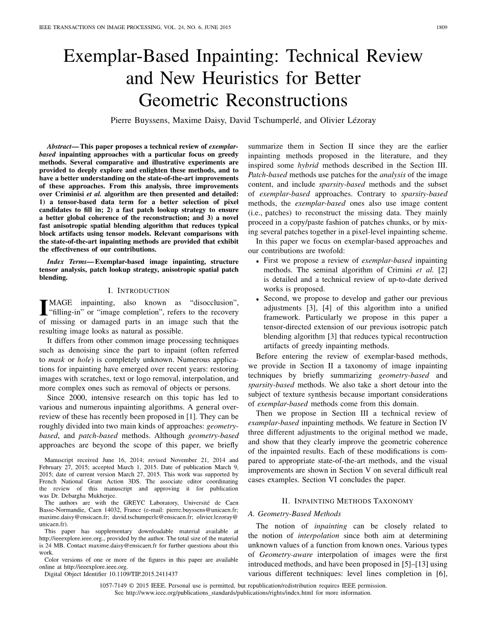 摘要 - 本文提出了基于样例的图像修复方法的技术评审,特别关注贪婪算法。 提供了几个有比较性和说明性的实验来对这些方法进行深入探索以及得到启发,并更好地了解这些方法的最新改进方向。从这个分析中,对Criminisi等人的算法进行了三项改进,然后进行了详细介绍:1)用于更好地选择要填充的像素候选项的基于张量的数据项; 2)快速样本块查找策略,以确保更好的全局一致性重建; 和3)一种新颖的快速各向异性空间混合算法,该算法使用张量模型来减少典型的块伪影。我们提供了与最先进的图像修复方法的相关比较,显示了我们贡献的有效性。