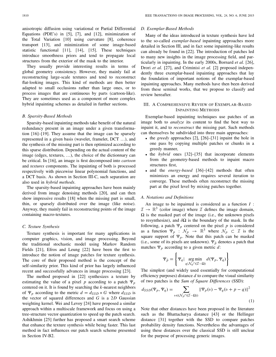 bull;以及基于能量的[36] - [42]方法,这些方法经常使能量最小化,并需要几次迭代才能收敛。 这些方法通常通过将匹配块混合在一起来重建像素级的缺失部分。