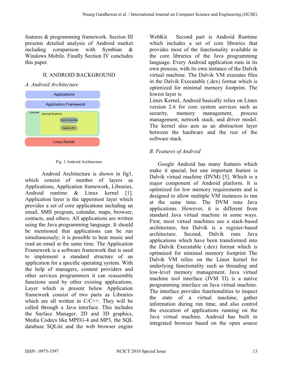 本文的其余部分安排如下:第二节简要介绍Android的背景,包括架构,本文的其余部分安排如下:第二部分简要介绍了Android的背景,包括架构,功能和编程框架。 第三部分详细分析了Android市场,包括与Symbian和Windows Mobile的比较。 最后,第四节总结他的论文。