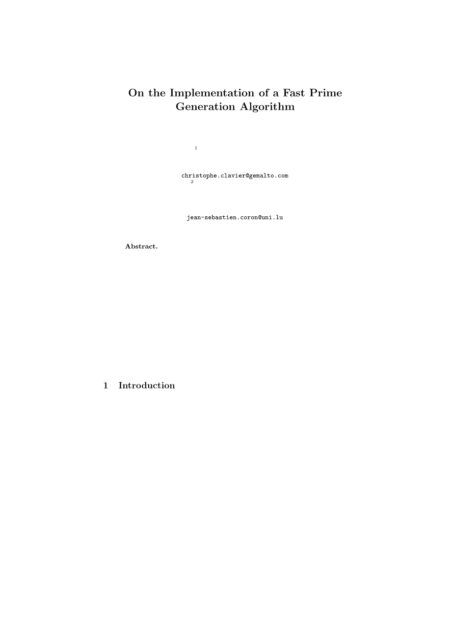 5. M. Joye, P. Paillier and S. Vaudenay, Efficient Generation of Prime Numbers. Proceedings of CHESrsquo;00, Lecture Notes in Computer Science, Springer-Verlag No 1965, pp. 340-354.
