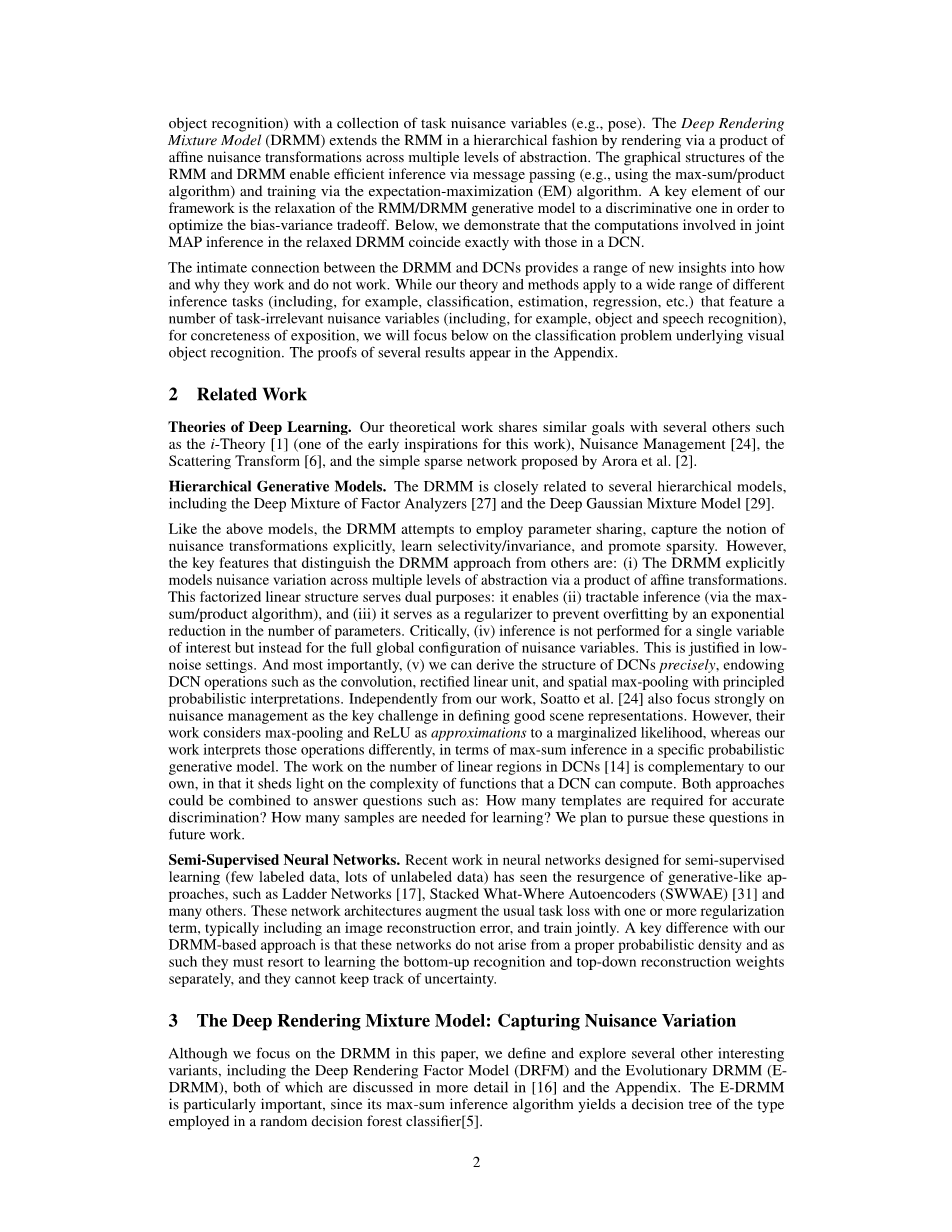 与上述模型一样,DRMM试图采用参数共享,捕捉显式地进行讨厌的变换,学习选择性/不变性,并促进稀疏性。然而,区别DRMM方法与其他方法的关键特性是:(i)DRMM方法通过仿射变换的一个乘积,对多个抽象层次上的变化进行建模。这种因式分解的线性结构有两个目的:它支持(ii)可处理的推理(通过最大和/积算法),以及(iii)它作为正则化器,以防止指数函数的过度拟合减少参数数量。关键是,(iv)没有对单个变量进行推断,有趣的是,相反,对于讨厌的变量的完整全局配置。这在低噪声设置下是合理的。最重要的是,(v)我们可以精确地导出DCNs的结构DCN操作,如卷积,校正线性单位,空间最大池与原则概率解释。独立于我们的工作,Soatto等人[24]也非常关注于妨害管理,这是定义良好场景表示的关键挑战。然而,他们的工作认为最大池和ReLU近似边缘化的可能性,而我们的这项工作对这些操作的解释不同,在一个特定的概率条件下的最大和推断生成模型。关于DCNs中线性区域数目的工作[14]是对我们的研究的补充,它揭示了DCN可以计算的函数的复杂性。两种方法可以结合起来回答这样的问题:需要多少模板才能获得准确区别?学习需要多少样本?我们计划在2010年继续探讨这些问题今后的工作。