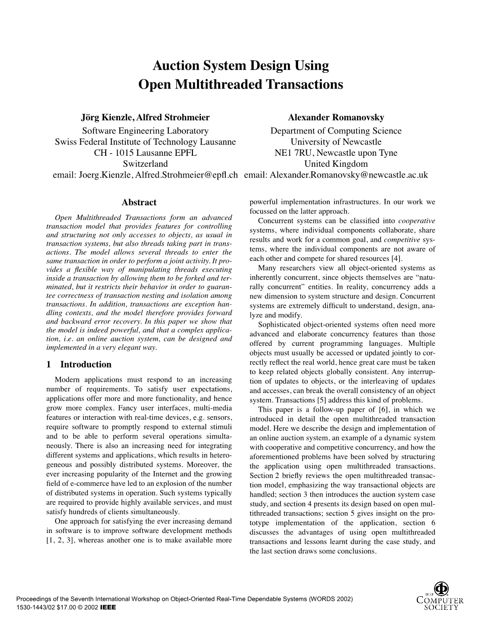 本文是[6]的后续论文,其中我们详细介绍了开放式多线程事务模型.. 在这里,我们描述了一个在线拍卖系统的设计和实现,一个具有合作和竞争并发的动态系统的例子,以及如何通过使用开放的多线程事务构造应用程序来解决上述问题。 第二节简要回顾了开放多线程转换模型,强调了事务对象的处理方式;第三节介绍了拍卖系统案例研究,第四节介绍了基于开放多线程事务的设计;第五节深入了解了应用程序的支持类型实现,第六节讨论了使用开放多线程事务的优点和在案例研究中吸取的经验教训,最后一节得出了一些结论。