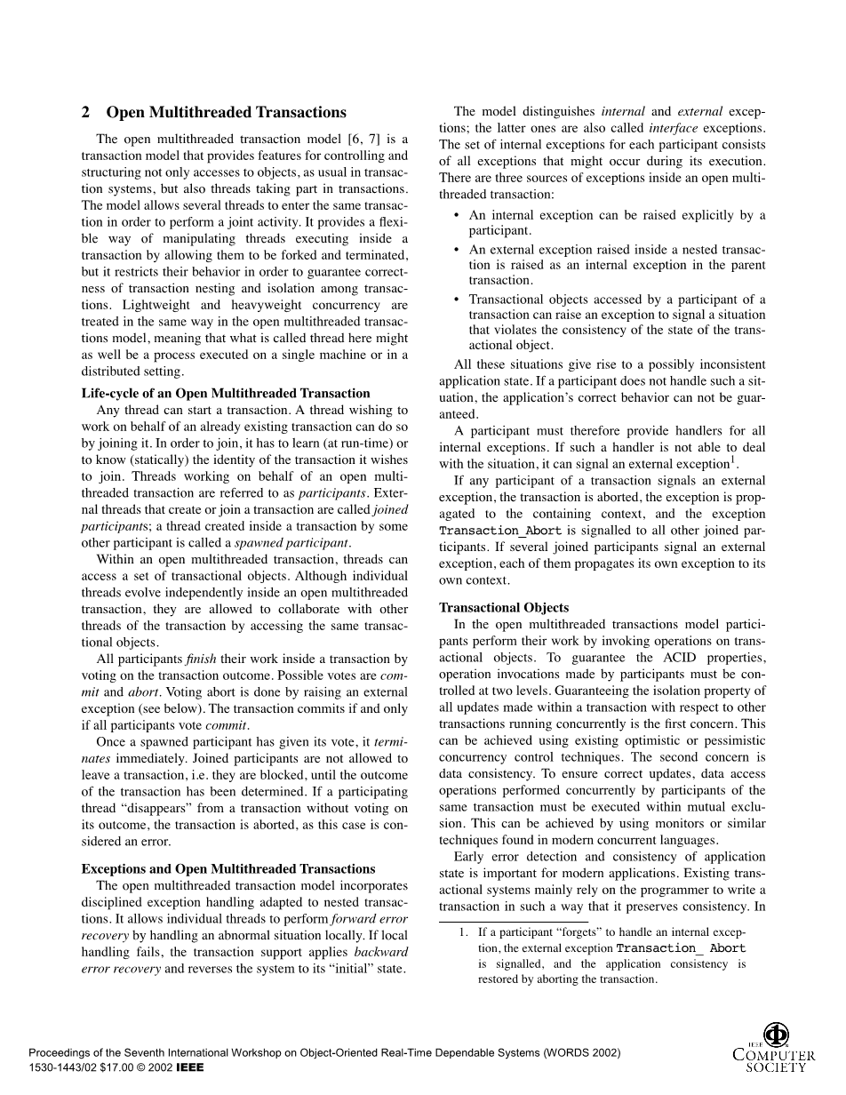 开放的多线程事务模型[6,7]是一个事务模型,它提供了一个特性,不仅可以像在传输系统中一样控制和构造对对象的访问,而且还可以提供参与事务的线程。 该模型允许几个线程输入相同的传输,以执行联合活动。 它提供了一种灵活的方式来操作在事务中执行的线程,允许它们被分叉和终止,但它限制了它们的行为,以保证事务嵌套的正确性和事务之间的隔离。 轻量级和重量级并发在开放的多线程传输模型中以相同的方式处理,这意味着这里所谓的线程可能是在单台机器上或在分布式设置中执行的进程。